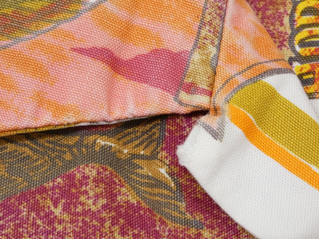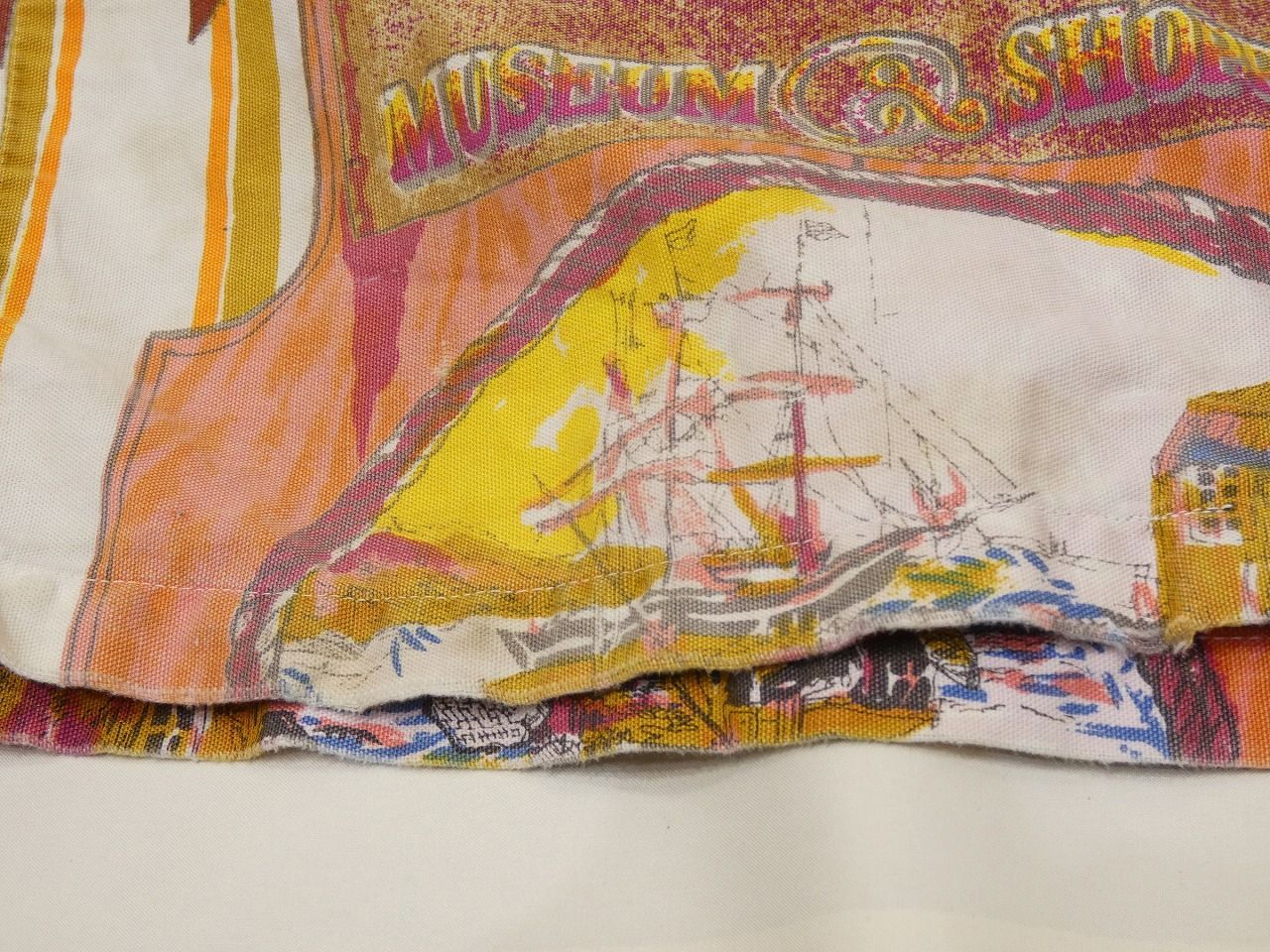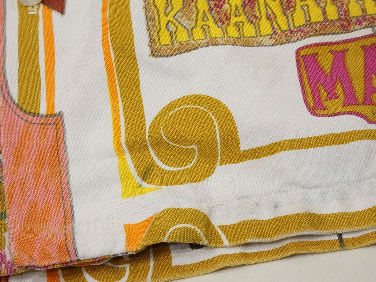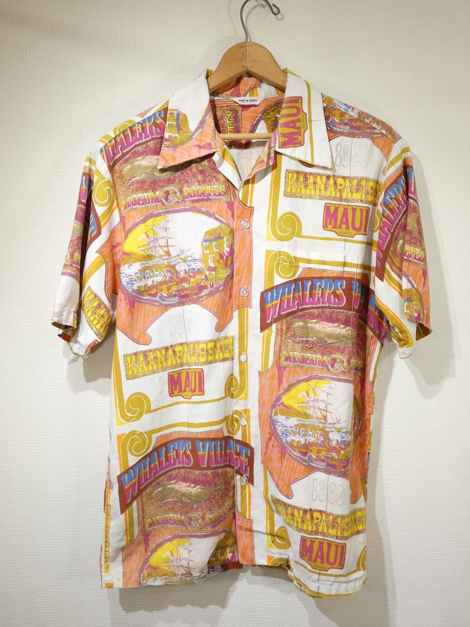 たまに見かけるハワイメイドのタグの付いた1枚で、襟は袋縫いで襟芯の入らないオープンカラーです。ポケットやフロントは綺麗に柄合わせされています。ハワイのマウイ島をモチーフにしたスーベニア物で、カアナパリ ビーチの街並みやホエラーズヴィレッジミュージアムのマッコウクジラ等がプリントされています。なかなかこの様なデザインも少ないですのでお好きな方は是非、ご検討下さい。