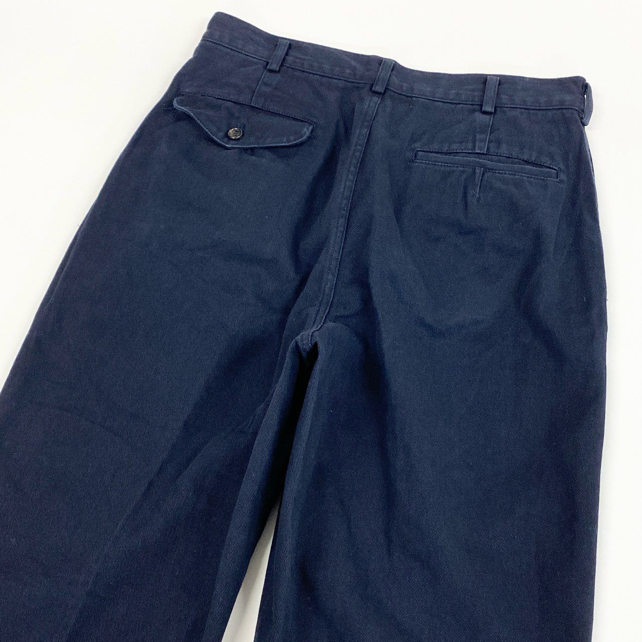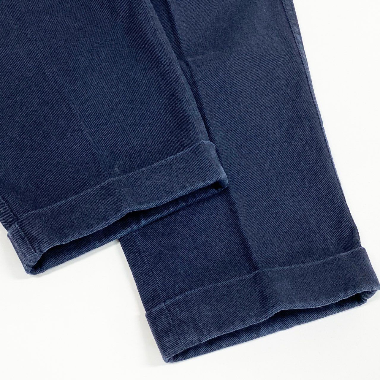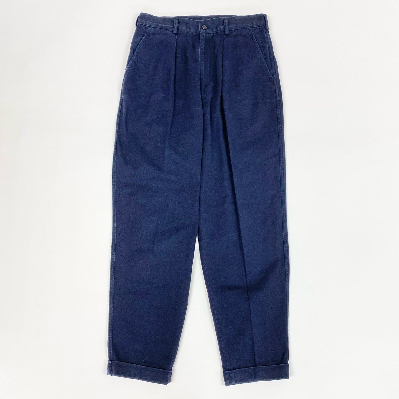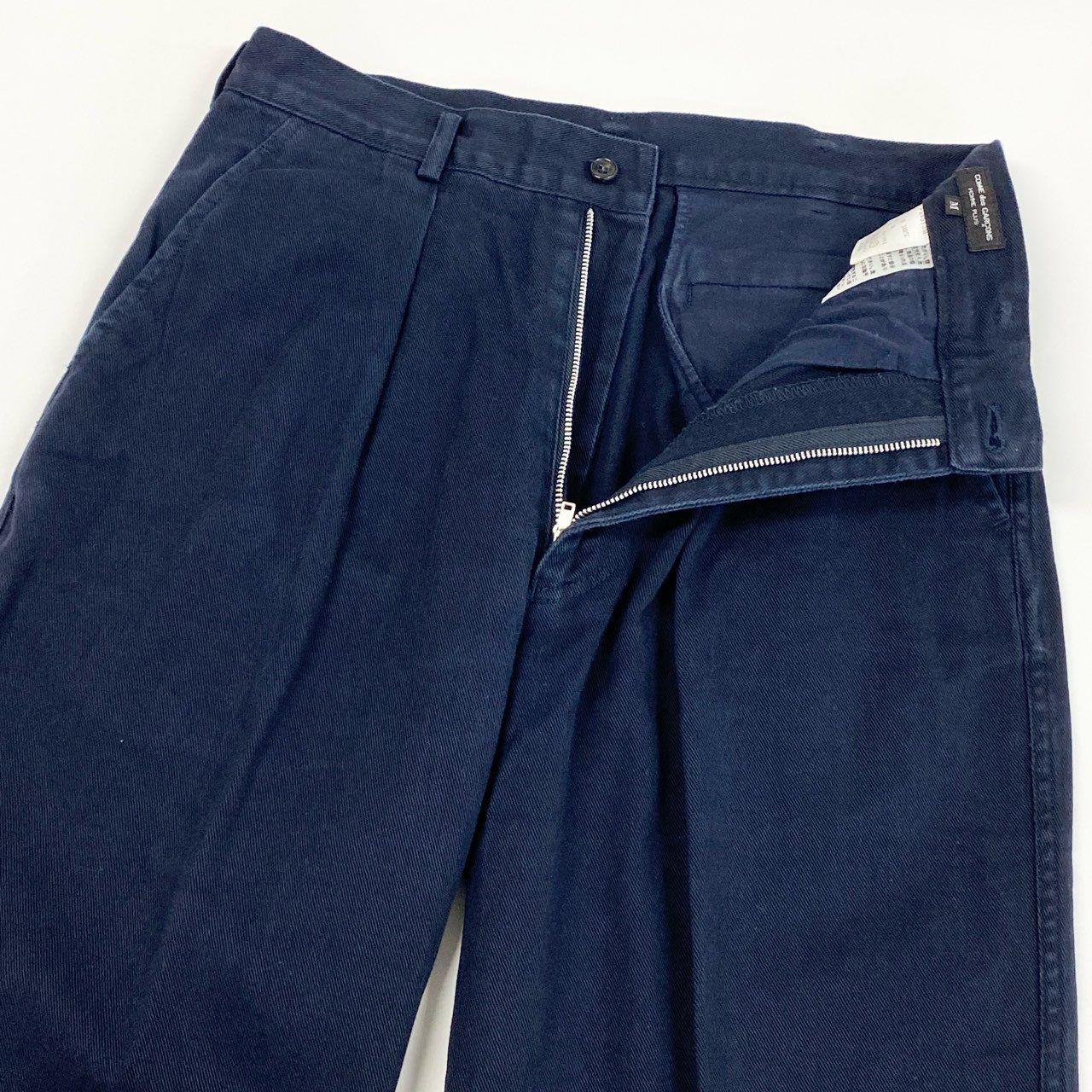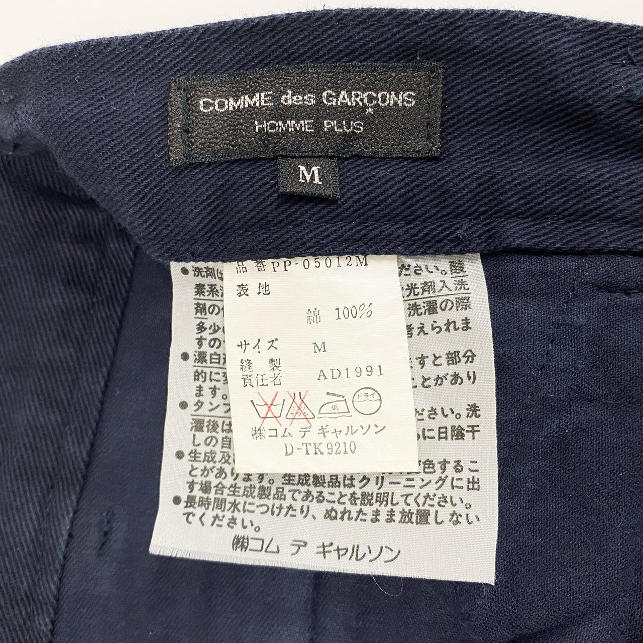 COMME des GARÇONS HOMME PLUSのタックパンツ(モデル:05012M)。深みのあるネイビーのコットン素材を使用し、マットな質感と落ち着いた印象を演出しています。タック入りで腰回りにゆとりを持たせつつ、裾にかけてすっきりとしたシルエットが特徴。シンプルながら上品な存在感を放ち、ジャケット合わせのモードスタイルからカジュアルなシャツコーデまで幅広く活躍する一本です。