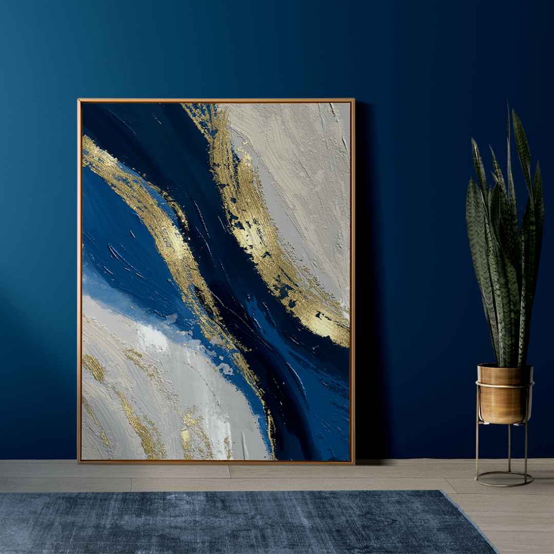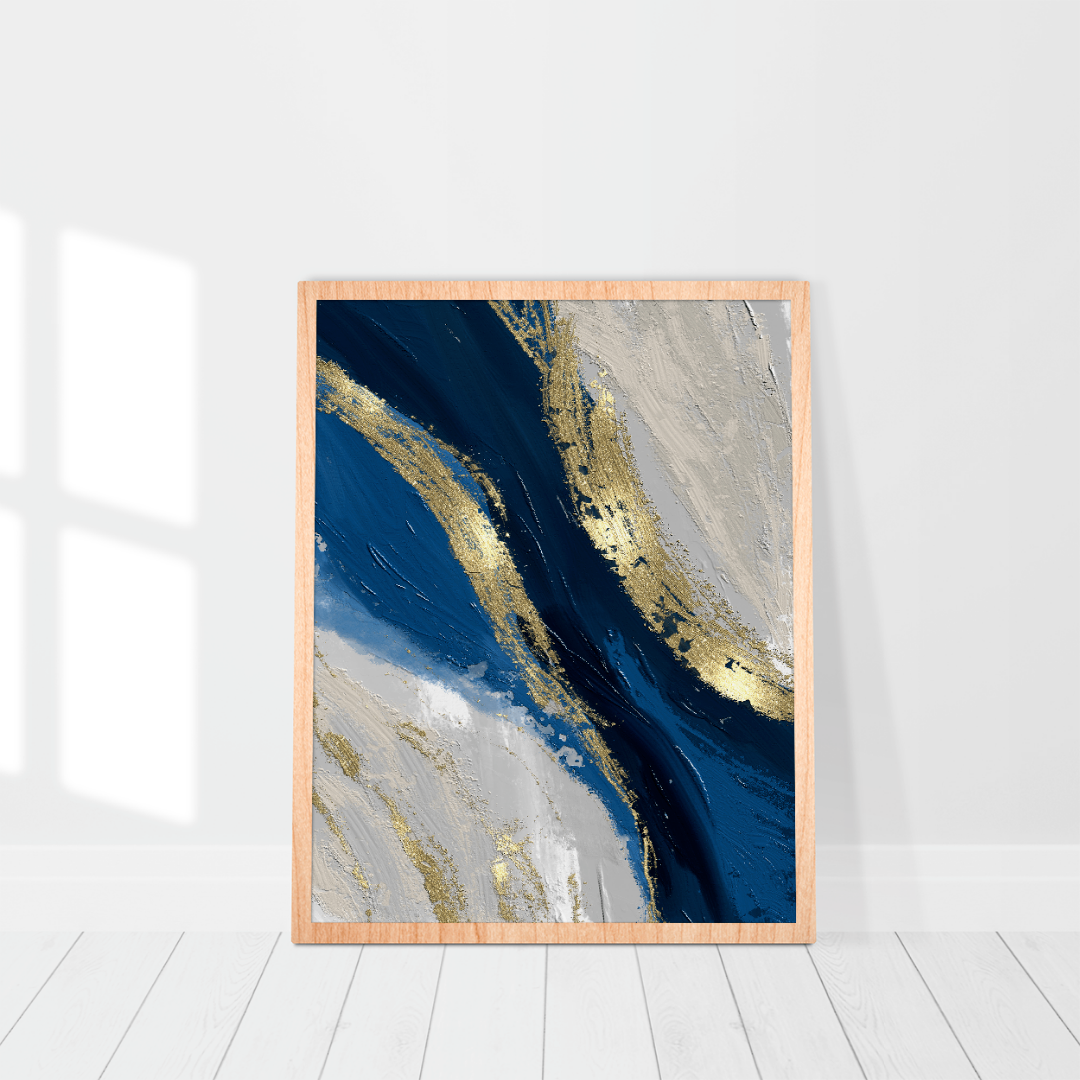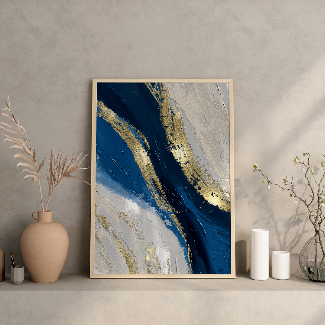 深いブルーと煌めくゴールドの流れるラインが印象的な抽象アートポスター。洗練されたデザインは高級感と落ち着きを両立し、リビングや寝室、書斎をワンランク上の空間に仕上げます。おしゃれなインテリアアイテムを求める方や、モダンな壁掛けアートを探している方におすすめです。