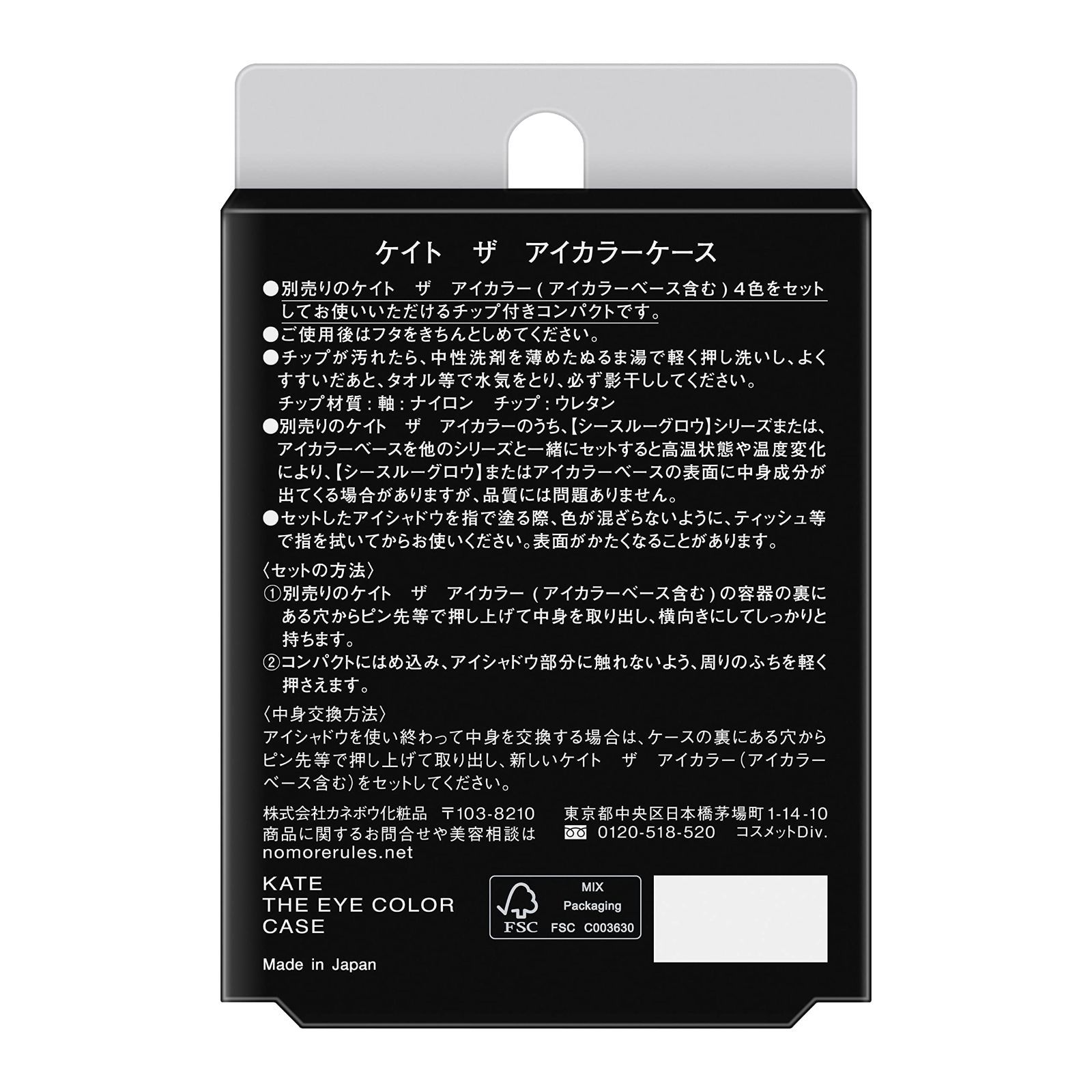●別売りのケイト ザ アイカラー(アイカラーベース含む)4色をセット してお使いいただけるチップ付きコンパクトです。 ●ご使用後はフタをきちんとしめてください。 ●チップが汚れたら、中性洗剤を薄めたぬるま湯で軽く押し洗いし、よくすすいだあと、タオル等で水気をとり、必ず影干ししてください。 ●別売りのケイト ザ アイカラーのうち、【シースルーグロウ】シリーズまたは、アイカラーベースを他のシリーズと一緒にセットすると高温状態や温度変化により、【シースルーグロウ】またはアイカラーベースの表面に中身成分が出てくる場合がありますが、品質には問題ありません。 ●セットしたアイシャドウを指で塗る際、色が混ざらないように、ティッシュ等で指を拭いてからお使いください。表面がかたくなることがあります。 使用方法 〈セットの方法〉 1別売りのケイト ザ アイカラー(アイカラーべース含む)の容器の裏にある穴からピン先等で押し上げて中身を取り出し、横向きにしてしっかりと持ちます。 2コンパクトにはめ込み、アイシャドウ部分に触れないよう、周りのふちを軽く押さえます。 〈中身交換方法〉 アイシャドウを使い終わって中身を交換する場合は、ケースの裏にある穴からピン先等で押し上げて取り出し、新しいケイト ザ アイカラー(アイカラーべース含む)をセットしてください。