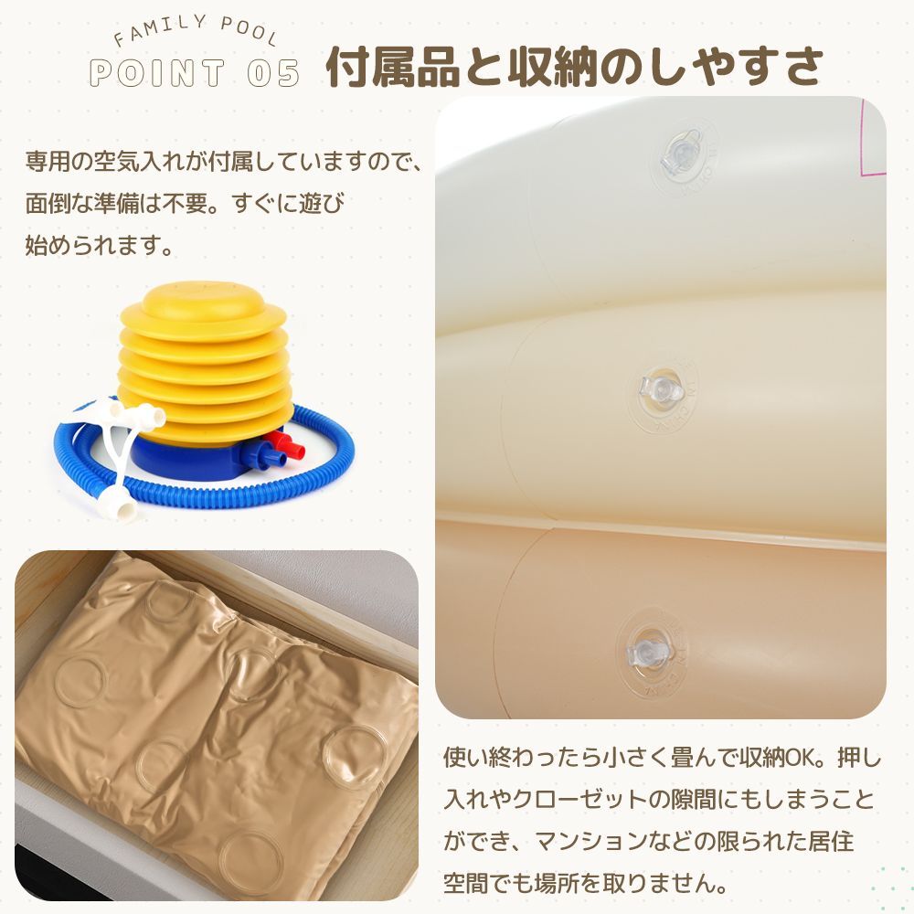 【付属品と収納のしやすさ】専用の空気入れが付属していますので、面倒な準備は不要。すぐに遊び始められます。使い終わったら小さく畳んで収納OK。押し入れやクローゼットの隙間にもしまうことができ、マンションなどの限られた居住空間でも場所を取りません。