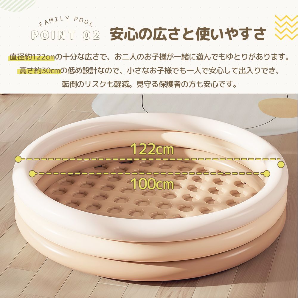【安心の広さと使いやすさ】2.直径約122cmの十分な広さで、お二人のお子様が一緒に遊んでもゆとりがあります。高さ約30cmの低め設計なので、小さなお子様でも一人で安心して出入りでき、転倒のリスクも軽減。見守る保護者の方も安心です。