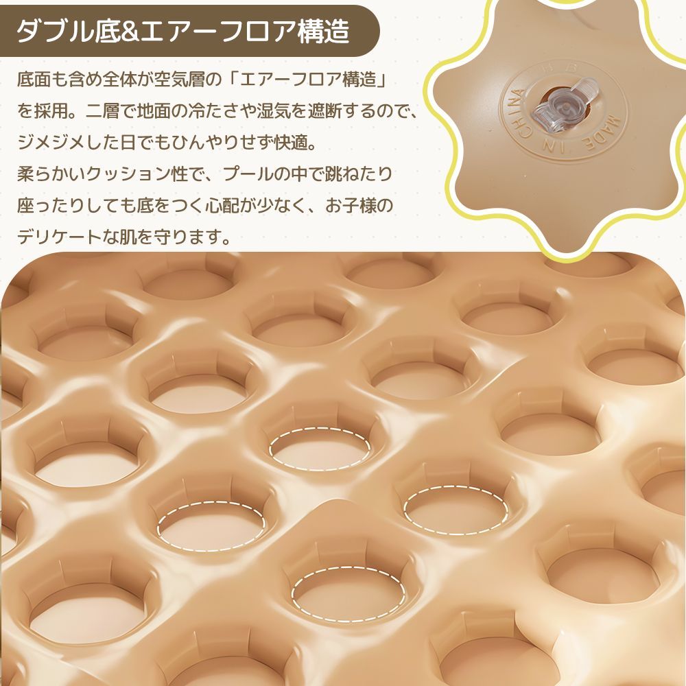 【ダブル底&エアーフロア構造】底面も含め全体が空気層の「エアーフロア構造」を採用。二層で地面の冷たさや湿気を遮断するので、ジメジメした日でもひんやりせず快適。柔らかいクッション性で、プールの中で跳ねたり座ったりしても底をつく心配が少なく、お子様のデリケートな肌を守ります。