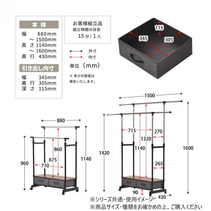 サイズ:幅880~1500×奥行430×高さ1140~1600mm
