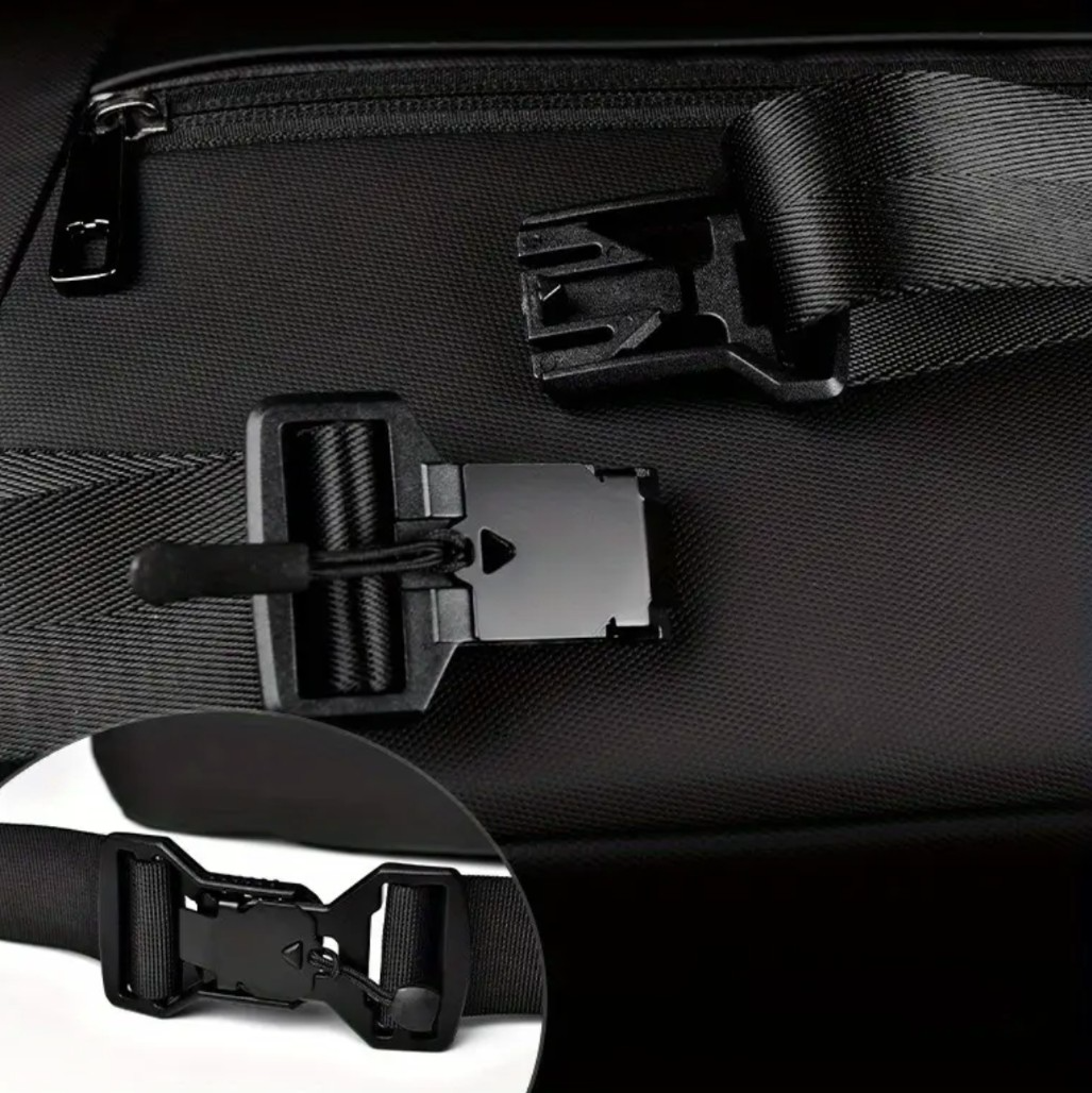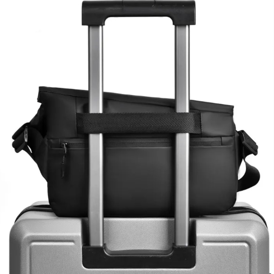 背面にはスーツケースのハンドルに通せるベルトがあります。