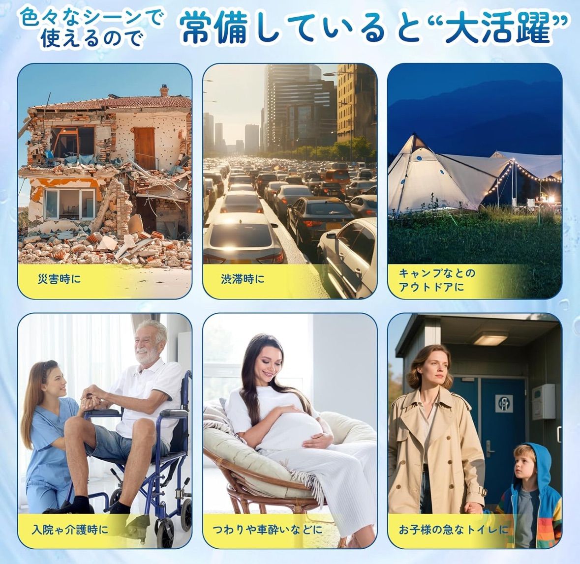 【多目的使用】携帯トイレは登山、キャンプなどの屋外活動や、交通渋滞時の車内、蹲るのが難しい妊婦や入院患者など、幅広い場面で使用できます。環境への汚染を避けるため、適切な処理をお願いします。
