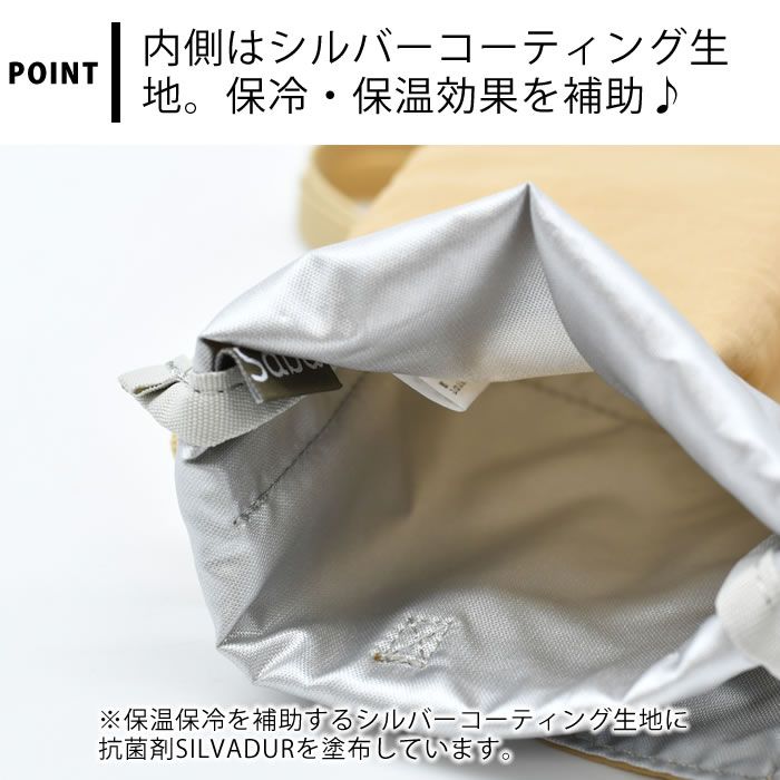 裏地のポリエステル生地にはシルバーコーティング加工で保冷・保温を補助。