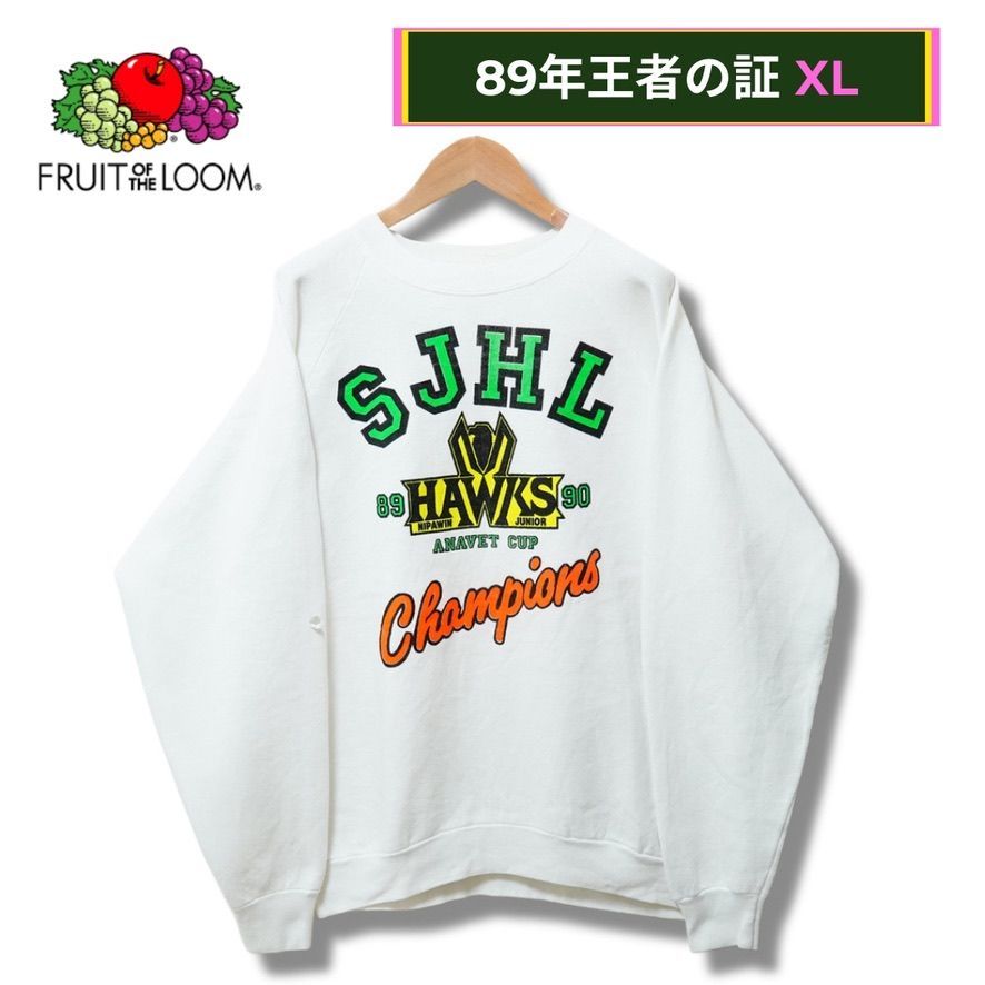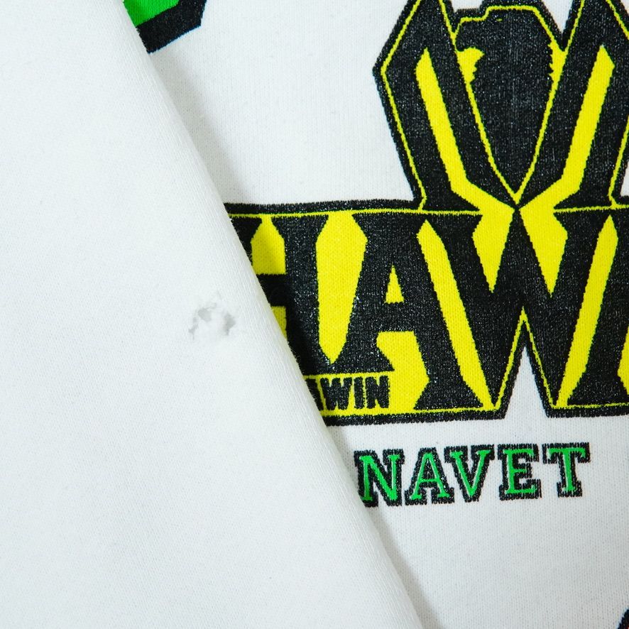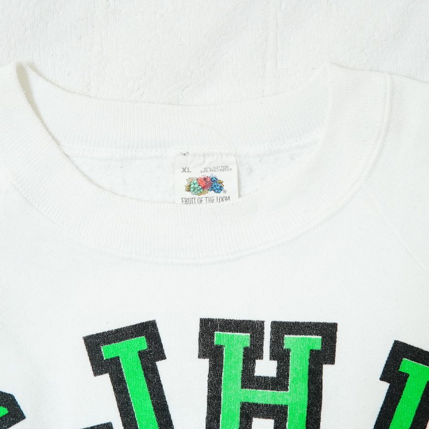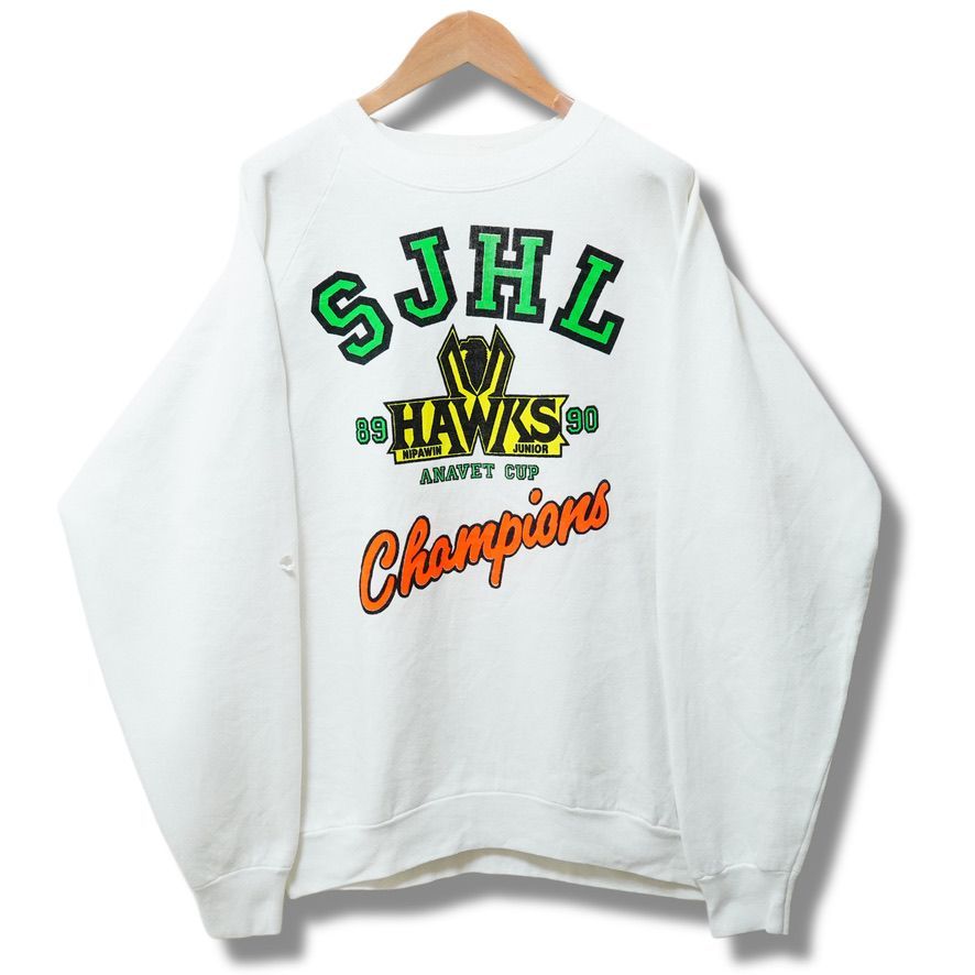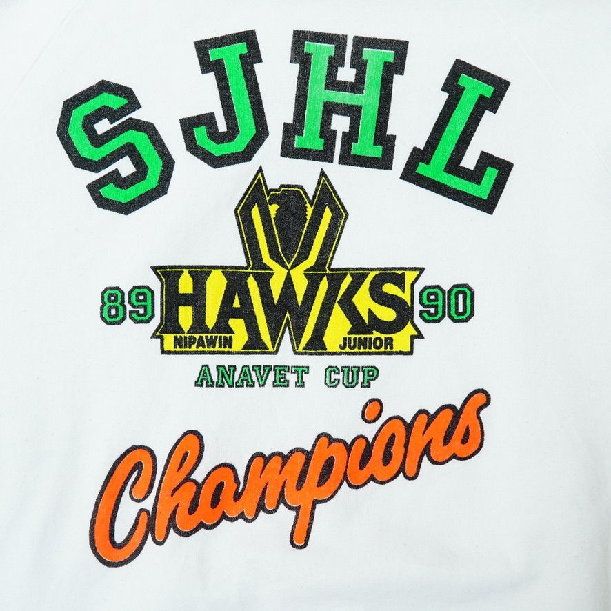 89-90年のホッケーリーグの優勝スウェット。グリーン×イエロー×オレンジのプリントが絶妙で、白ボディとのコントラストがとにかく洒落てます。