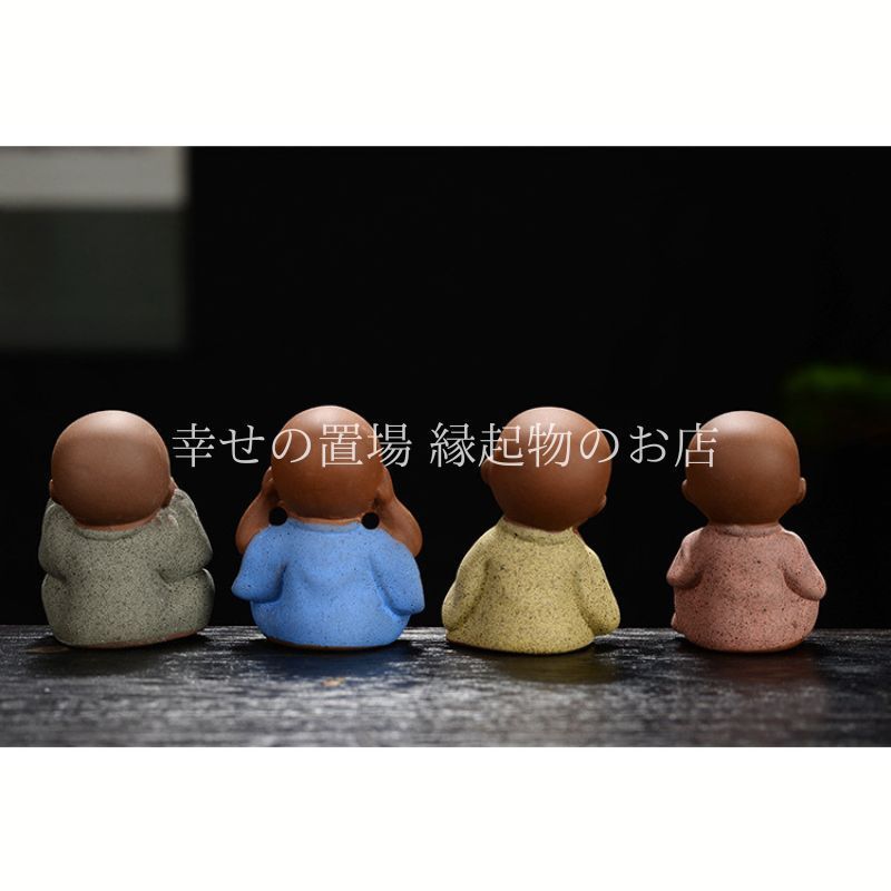 心を和ませる可愛らしい小和尚の置物は、茶席やリビング、玄関などに飾ることで穏やかな雰囲気をもたらしてくれるアイテムです。紫砂で丁寧に作られた小さな和尚たちは、それぞれ「見ざる・聞かざる・言わざる」や禅意を表すしぐさをしており、日常の中に静けさと調和を取り入れることができます。
