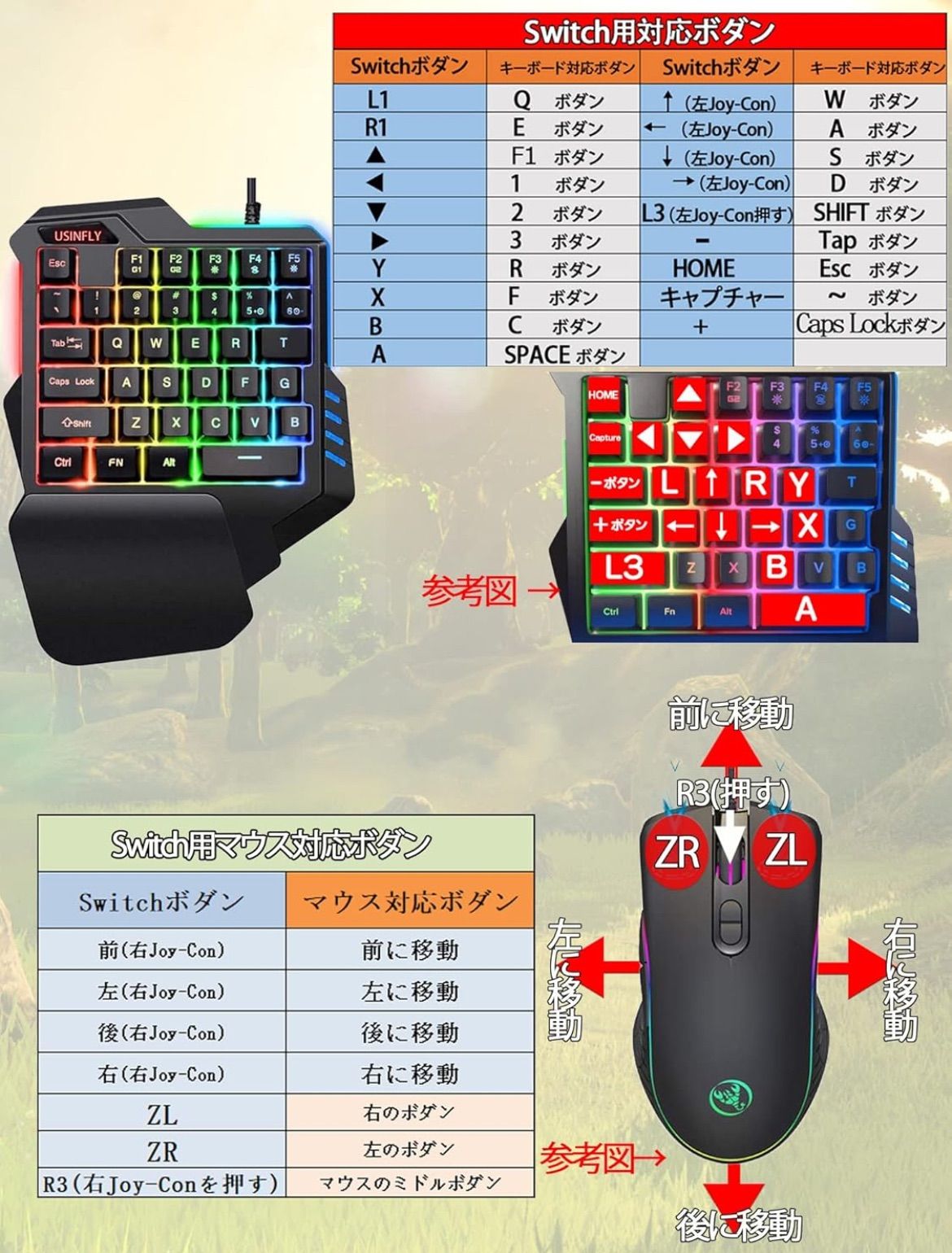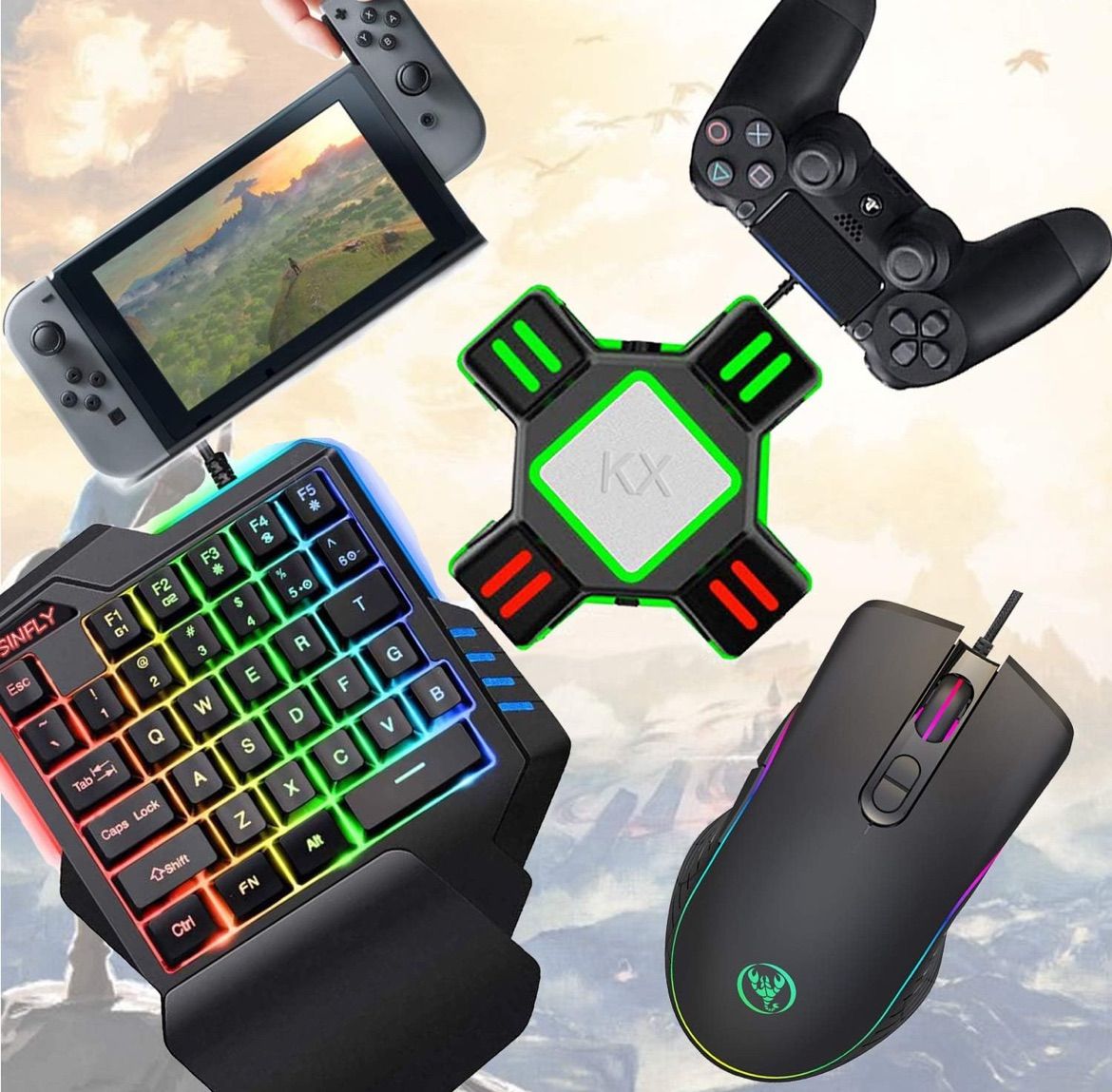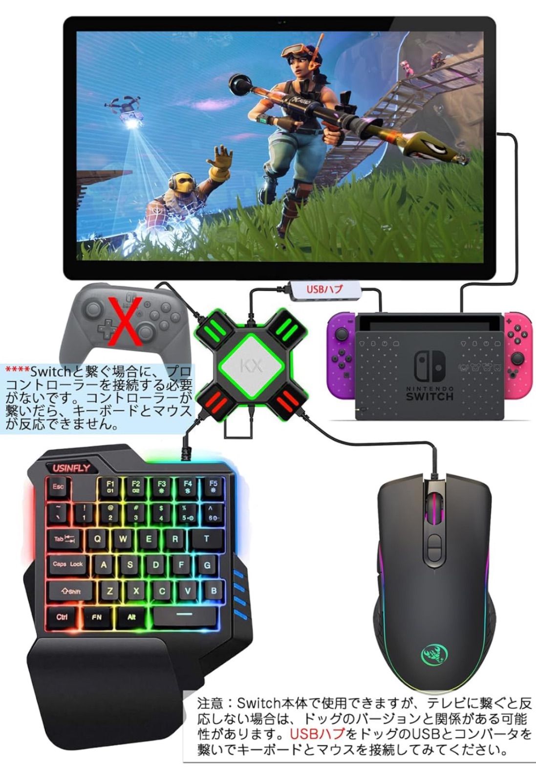 RGB片手キーボード、RGBマウスと専用コンバーター、Type-Cアダプタがセットしています。製品とご愛用のゲーム機の適合性を心配する必要がなくなります。他の不適切なコンバーターを買って、無駄金を使えたことを避けます。開封次第、ゲームを楽しめます!Switch /switch lite/PS4/PS4 Slim/PS4 Pro//PS3/Xbox One/Xbox One S/Xbox One X 本体に対応できます。FPS、TPS、RPG、RTSなどのゲームに最適です(APEXやマインクラフトなどのゲームに対応できないです。)。switchでforteniteに対応できますが、間違った繋ぎ方で接続できない場合があれば、出品者に問い合わせることを推奨します。ご注意:本製品はヘッドホン、ボイスチャットに対応できなくて、キーマッピングができないものです。ご了承のほどお願いします。