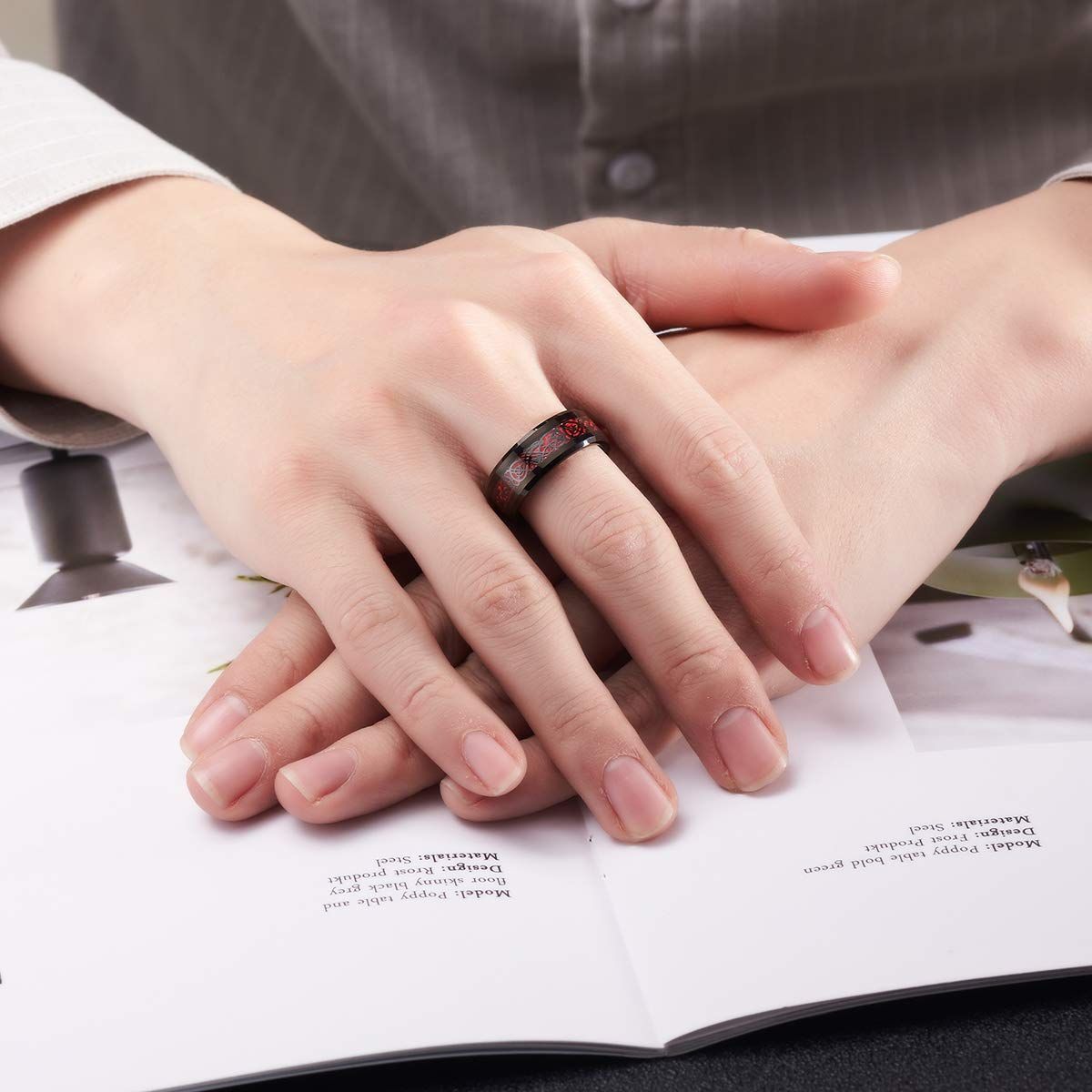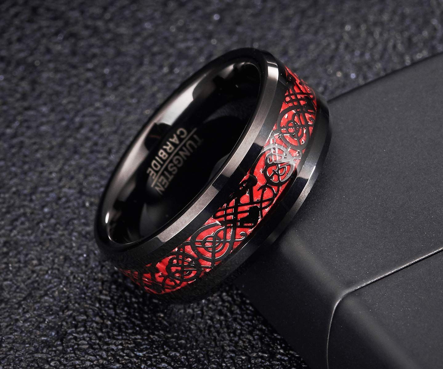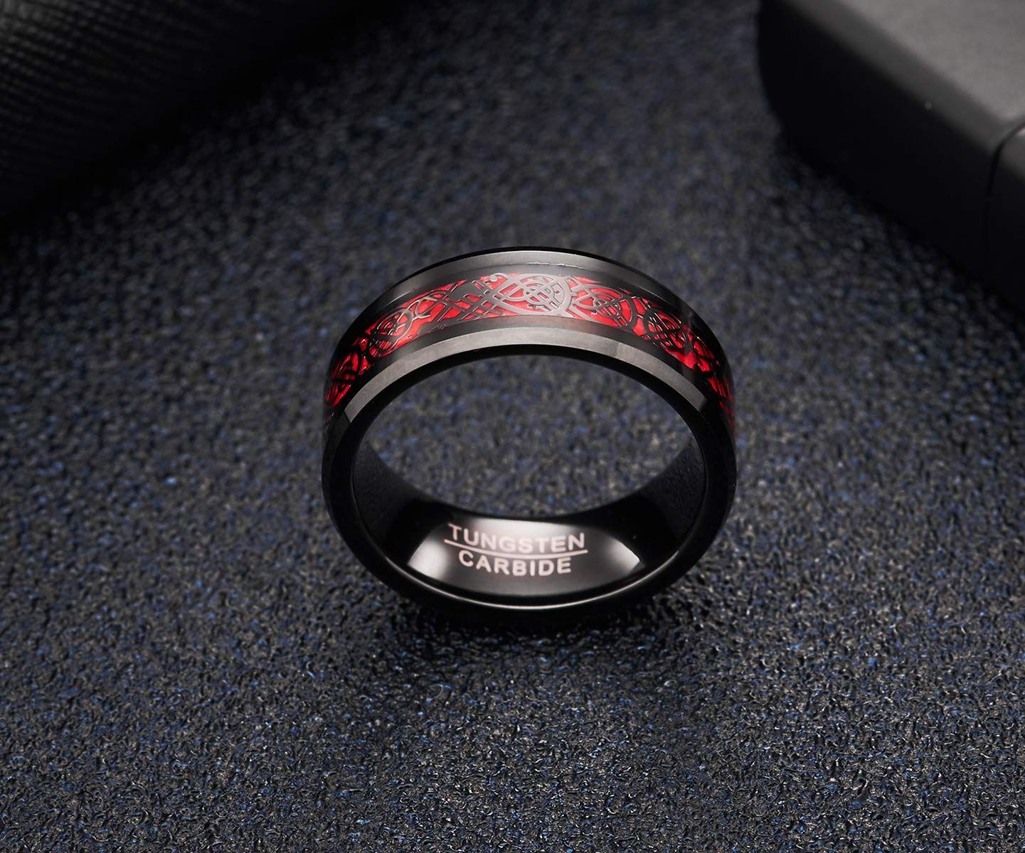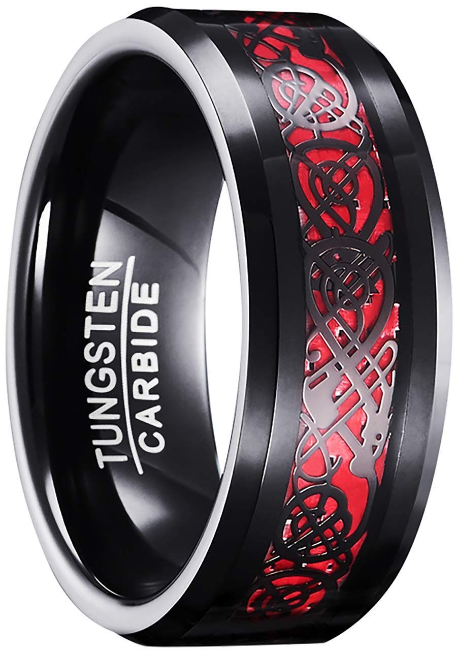 083基地 メンズ 指輪 リング タングステン ドラゴン 竜紋 カーボン 炭素繊維 横幅8mm 平打ち レッド 真空メッキ 15号