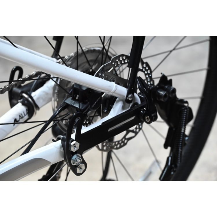 完成車既存のリアエンドスルーホールへインサート。中空の貫通孔へスタンドアダプタのクイックリリースを差し込み、スルーアクスル留め式機構をそのままに、リアエンド外側にスタンドアダプタ装着を可能にするコンバーター。ホローアクスル左側(挿入側)のレアエンドスルーホール接面距離を付属スペーサーで調整。スタンドアダプタとの接面距離調整はスタンドアダプタ付属のスペーサーで調整。