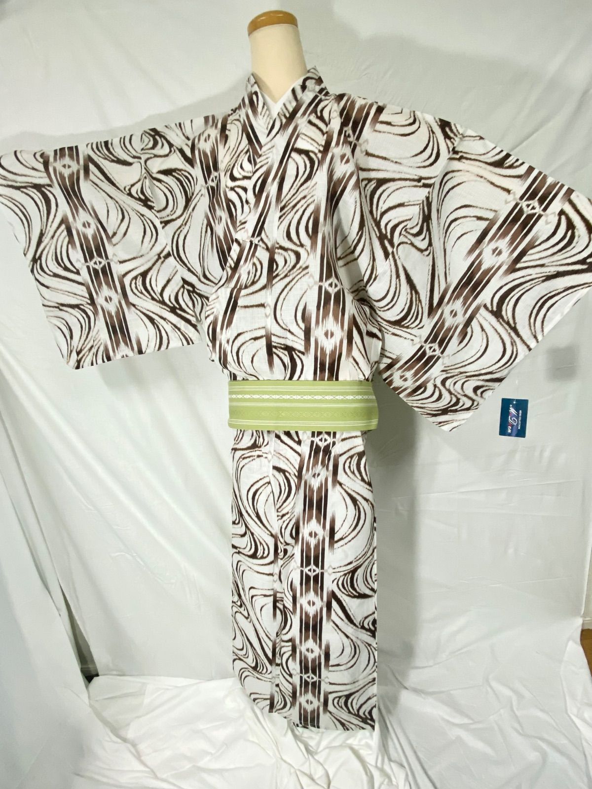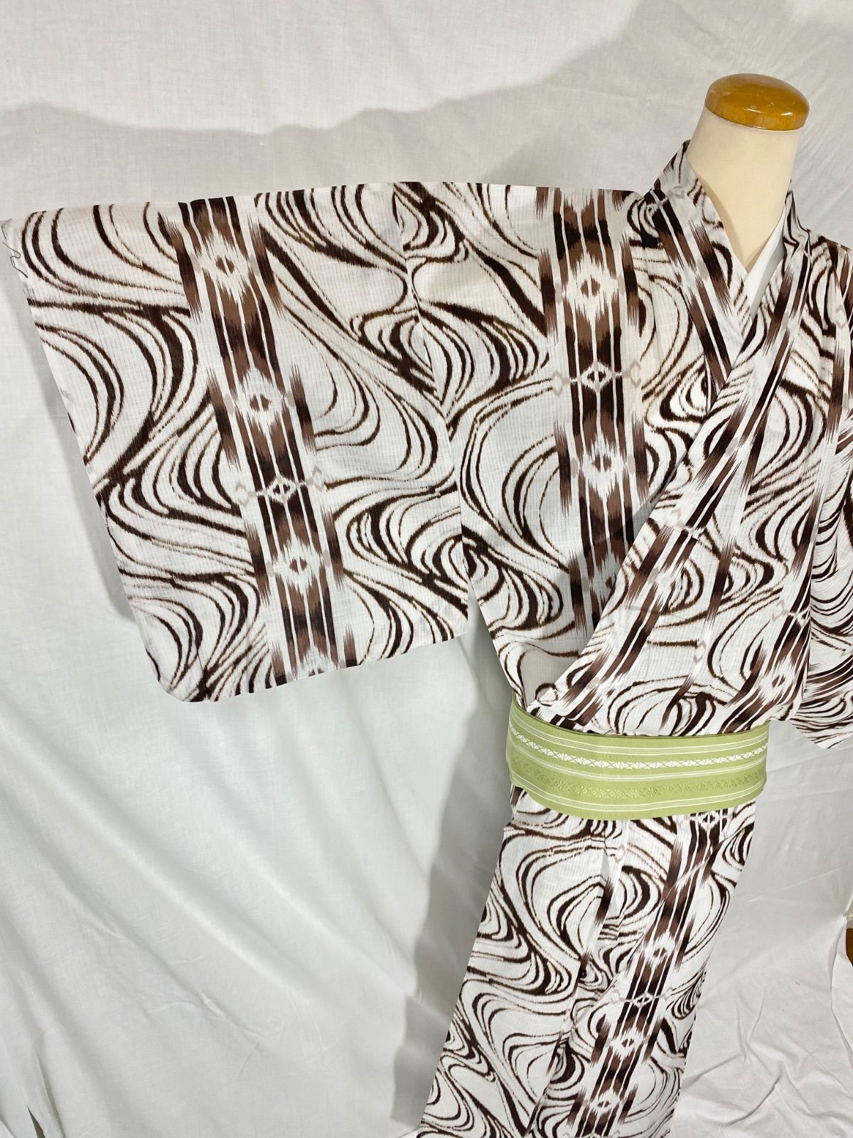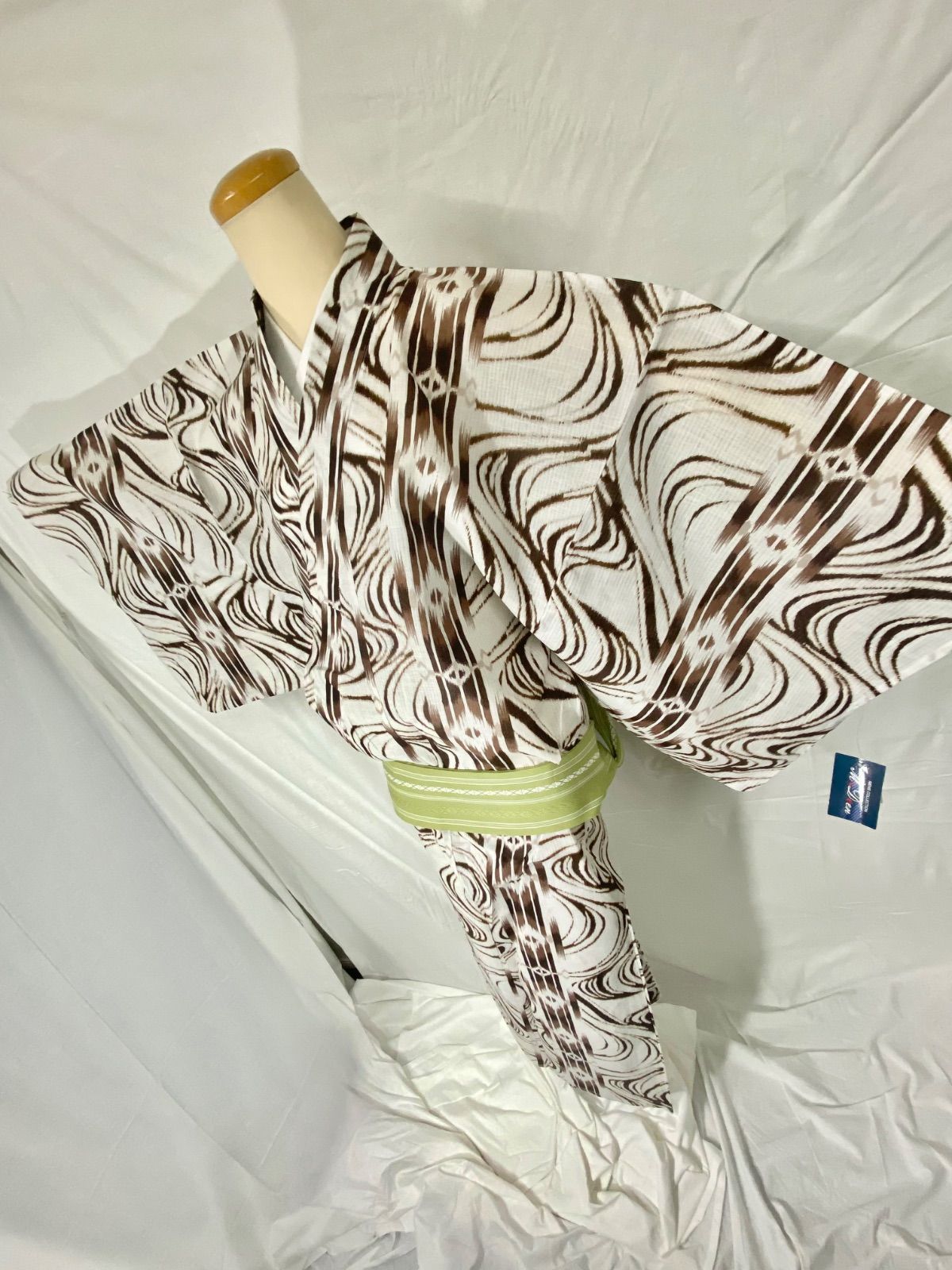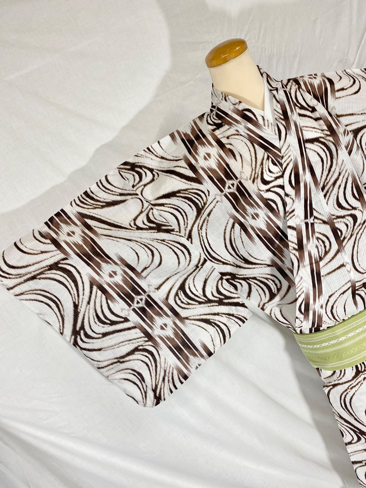 白地に茶色のウェーブ模様やひし形の模様がアクセントの浴衣です。