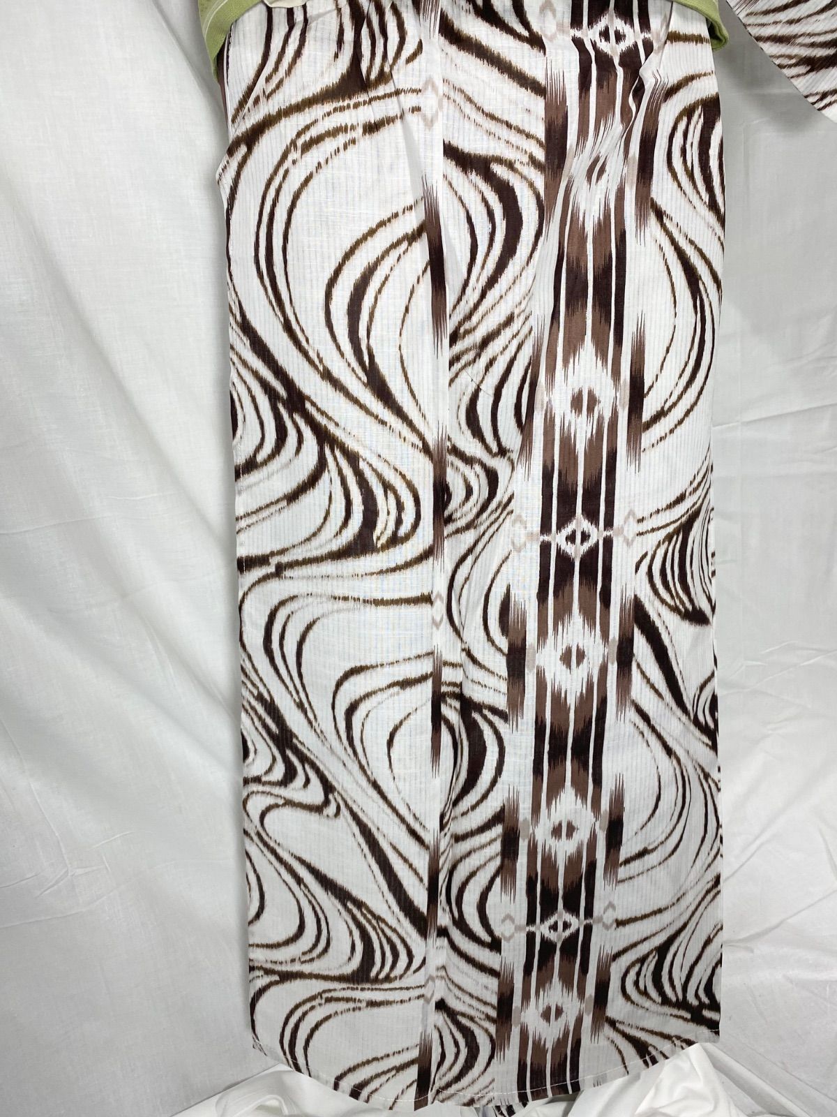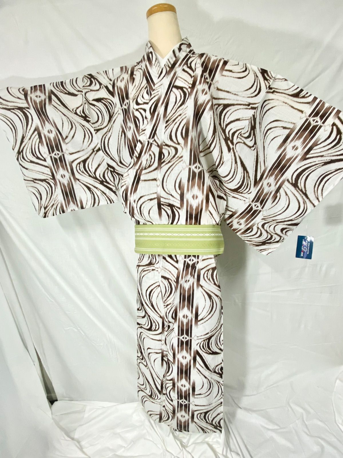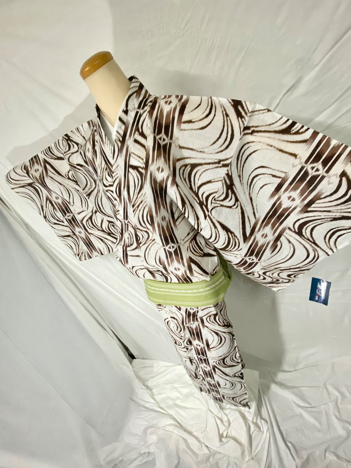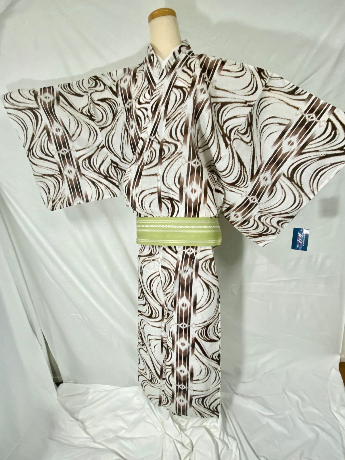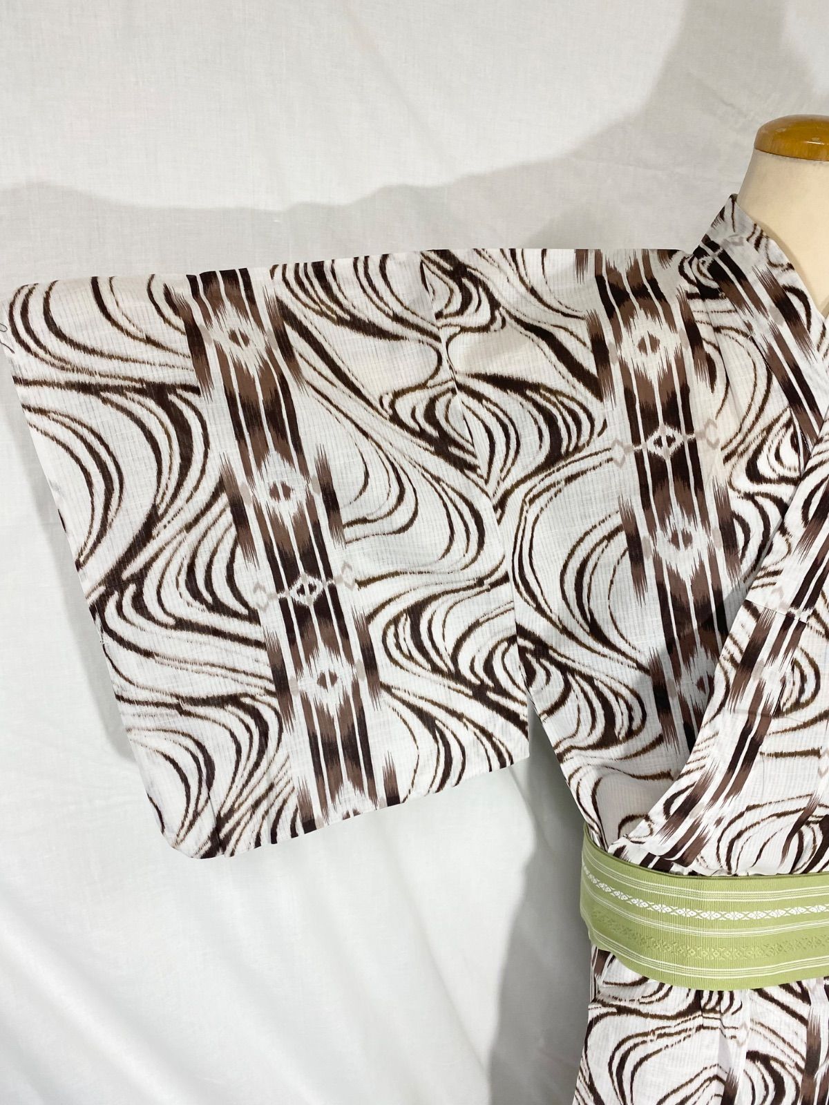 白地に茶色のウェーブ模様やひし形の模様がアクセントの浴衣です。
