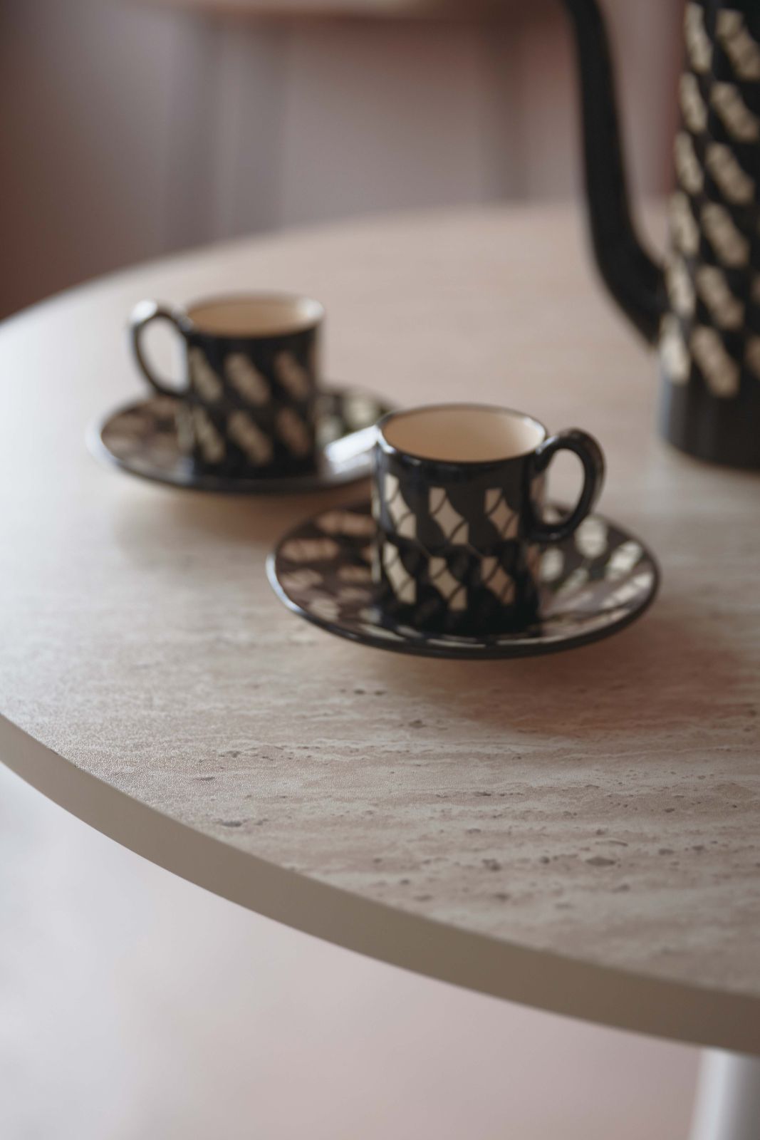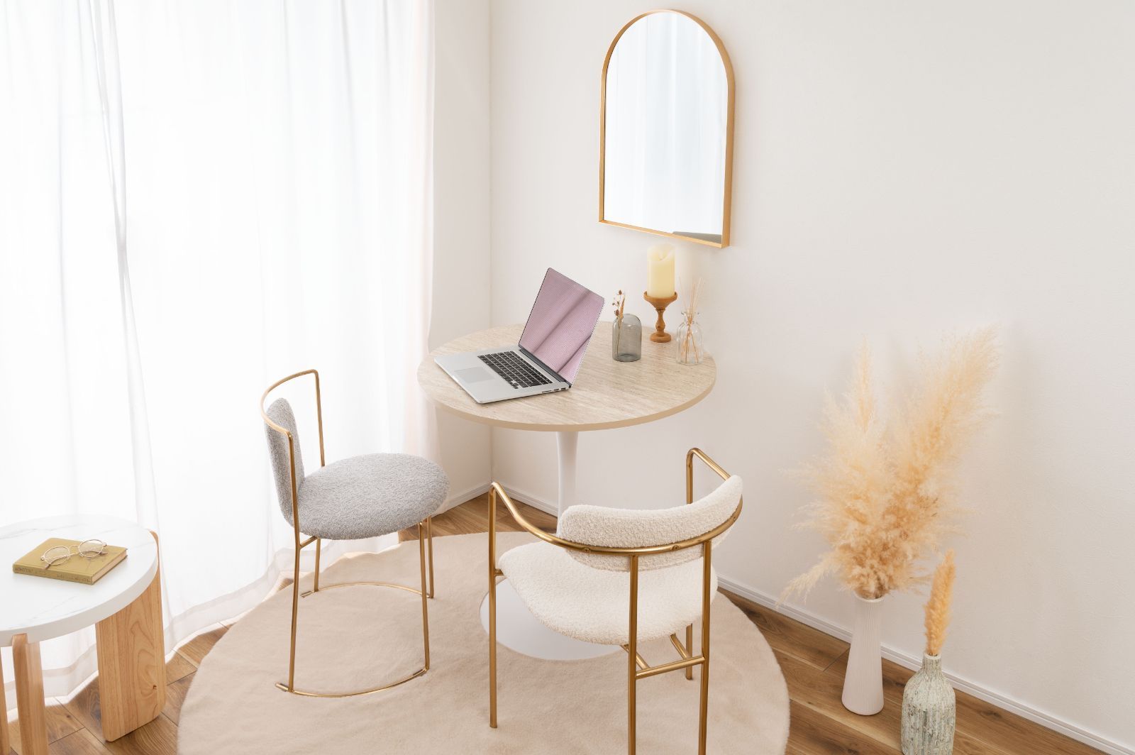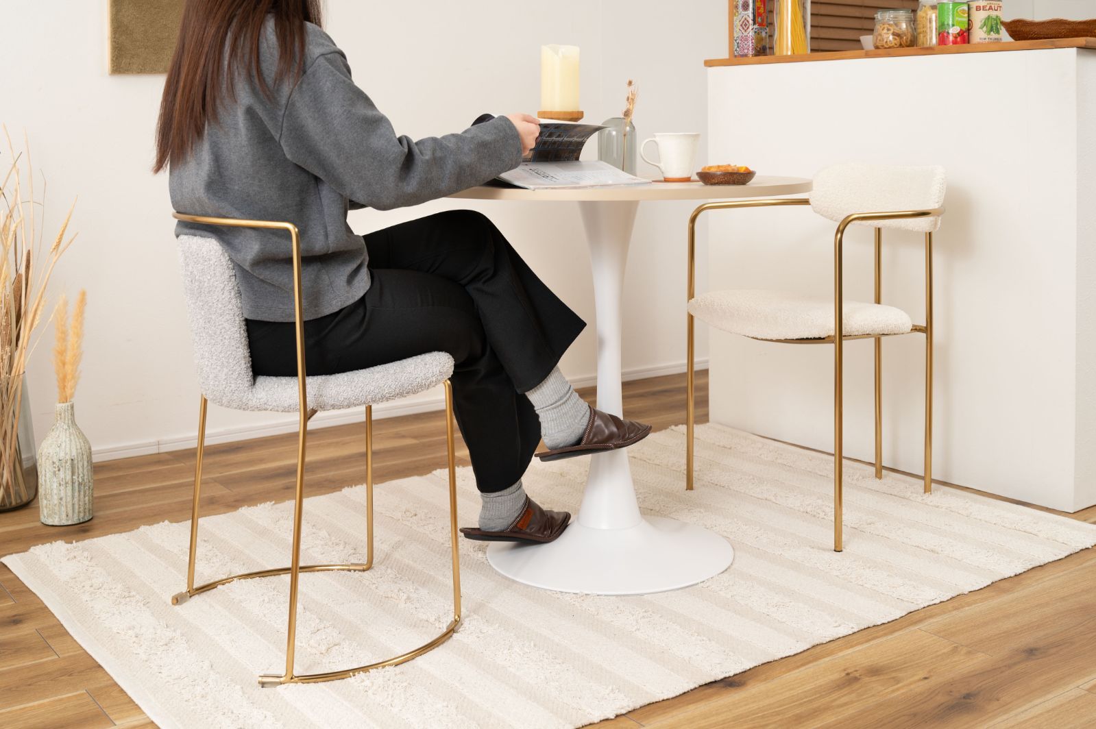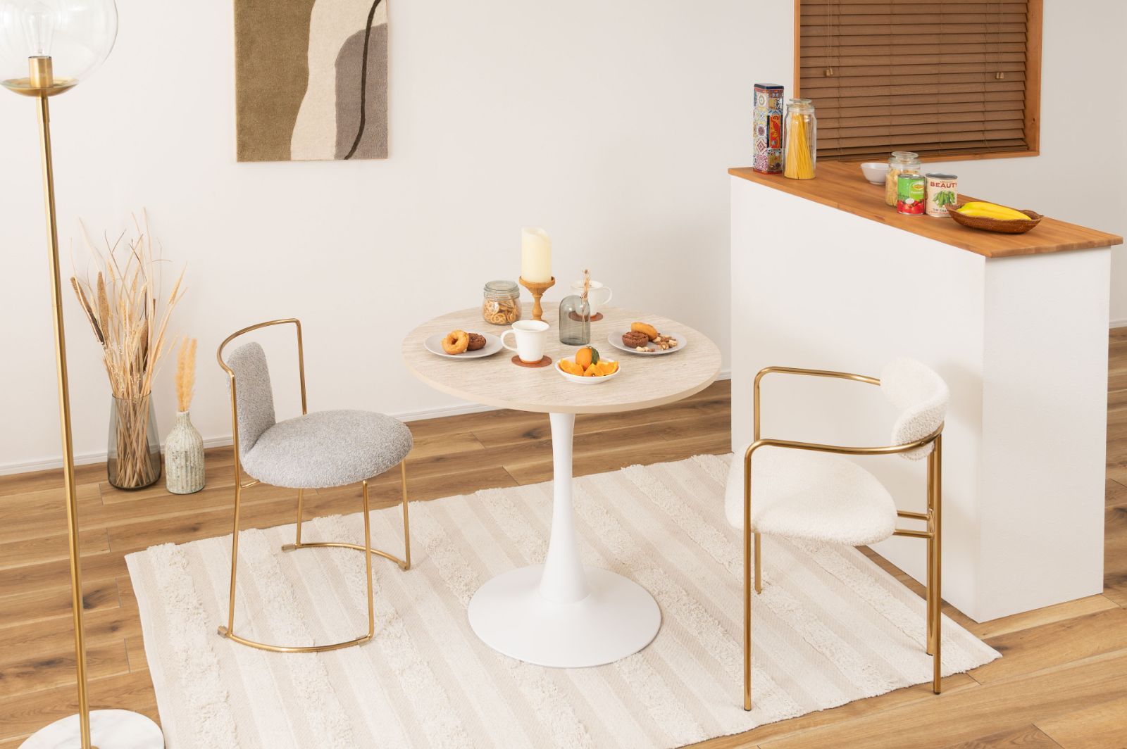 落ち着いた色味が美しい一本脚のラウンドテーブル 大理石調の天板と、ホワイトの脚部が優しい印象を与えるラウンドテーブル。