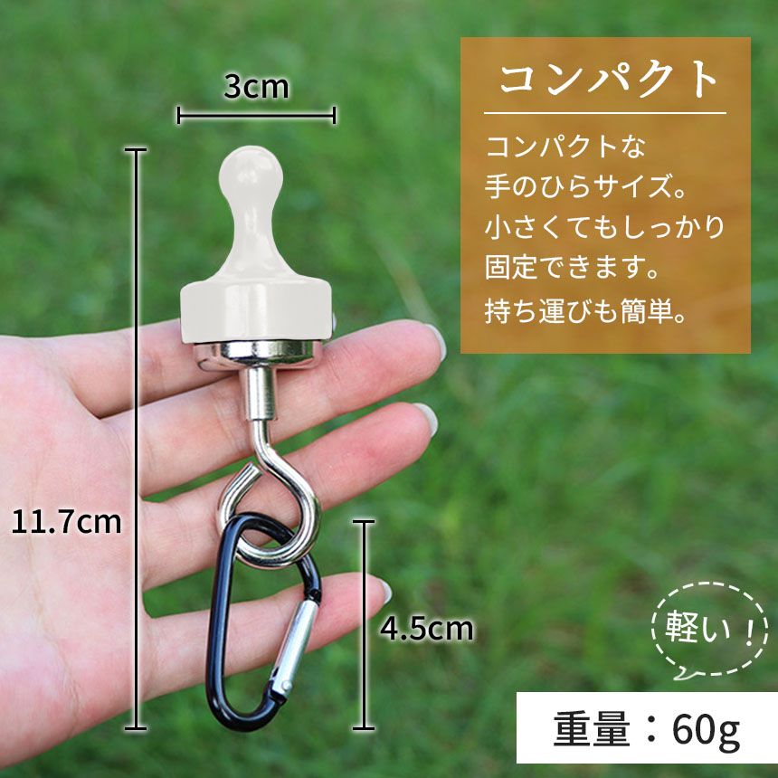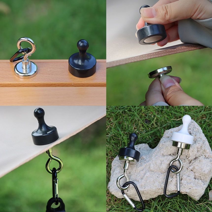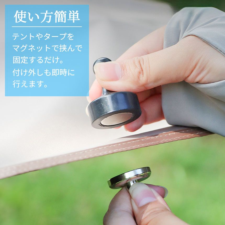 【キャンプで大活躍!】テントやタープを磁石で挟んで使用するマグネットフックです。テントの中にランタンを吊るすことができ、マグネットなので付け外しも簡単です。挟まずにマグネット単体としても使用できるので、冷蔵庫などの金属製の家具に吸着させて輪ゴムなどの小物を吊り下げるフックとしてもお使いいただけます。