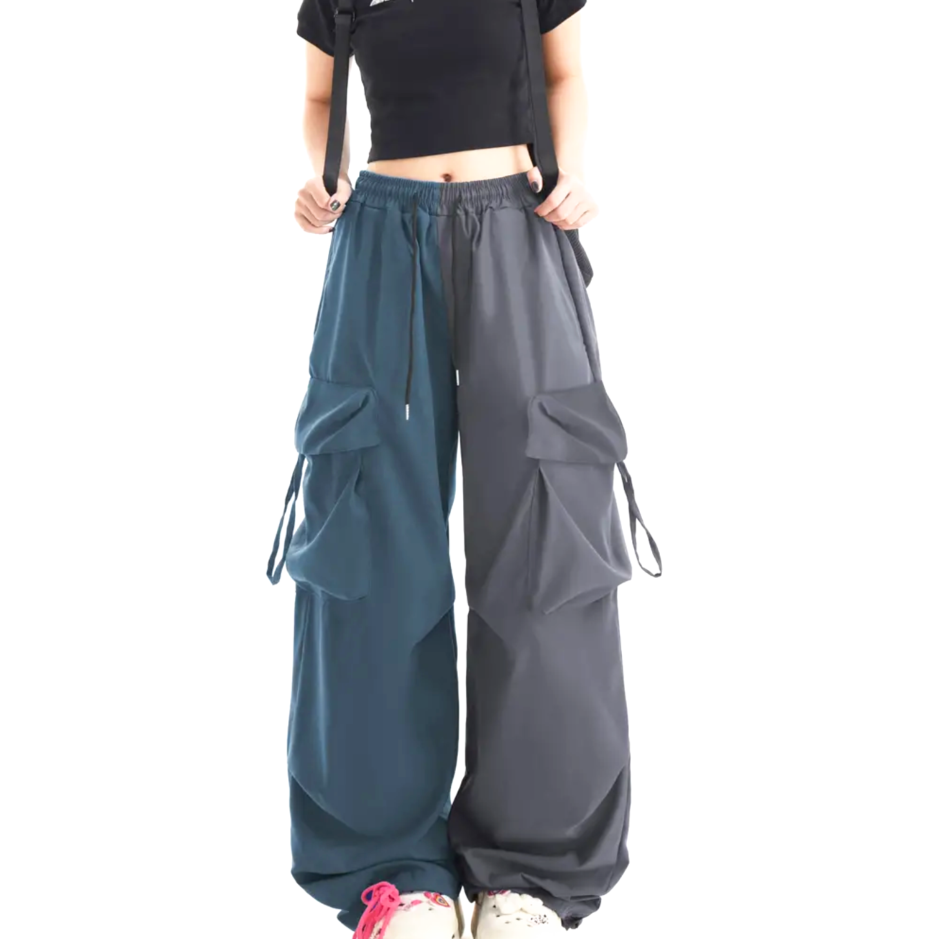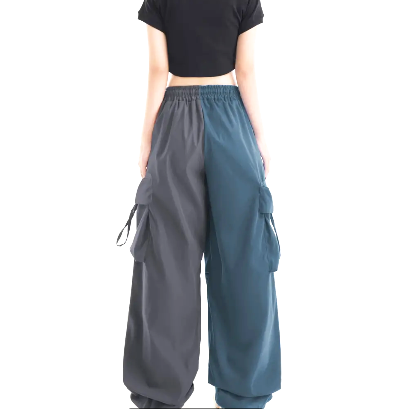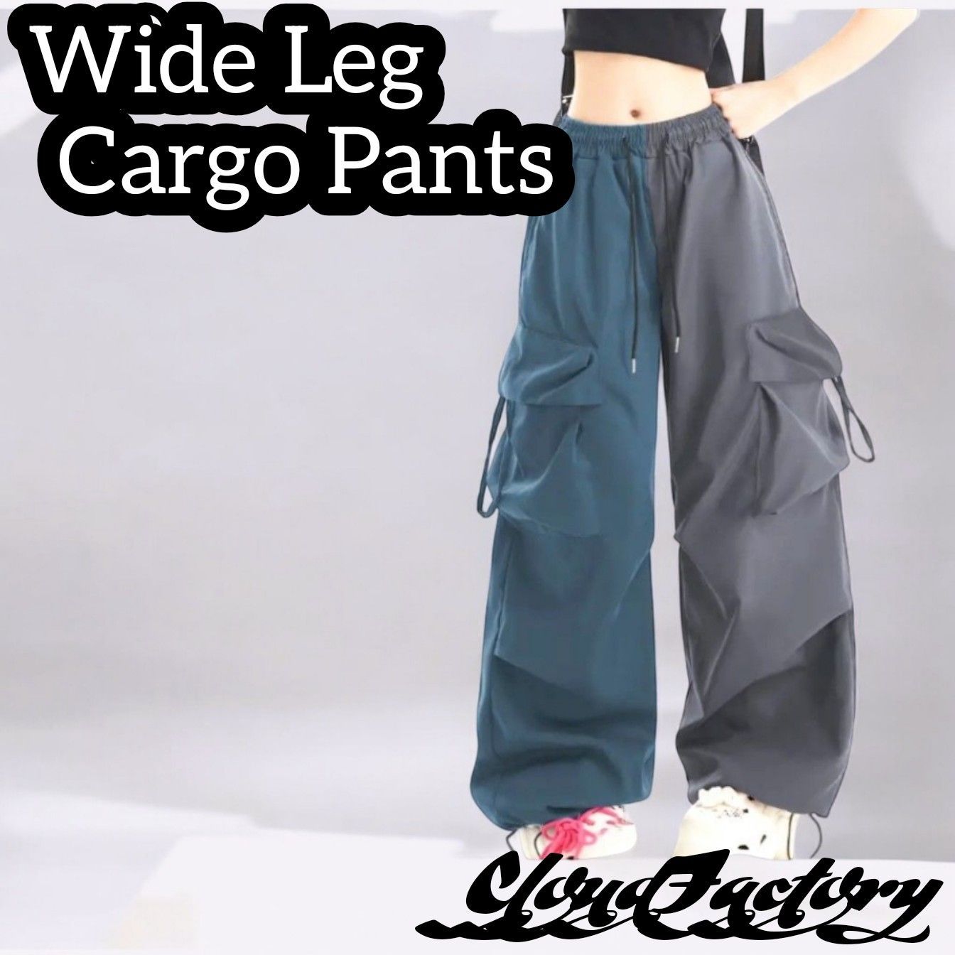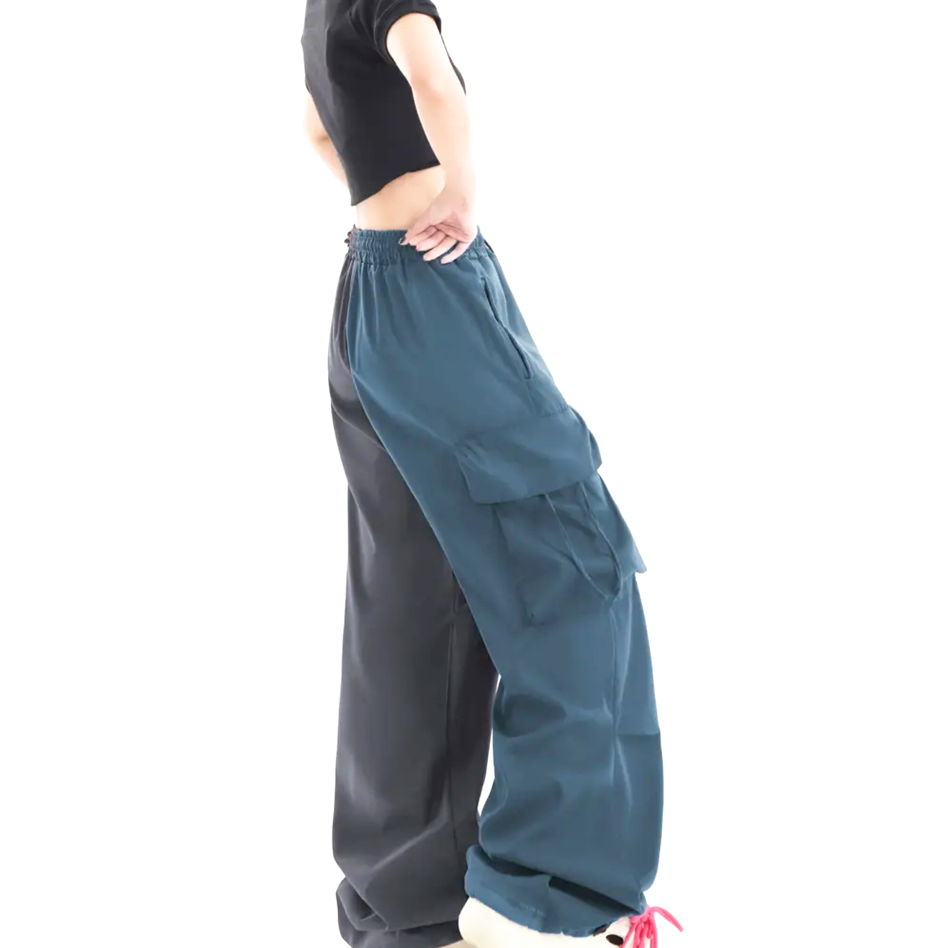 グレーとピーコックブルーのバイカラーがかっこいいワイドレッグパンツ。