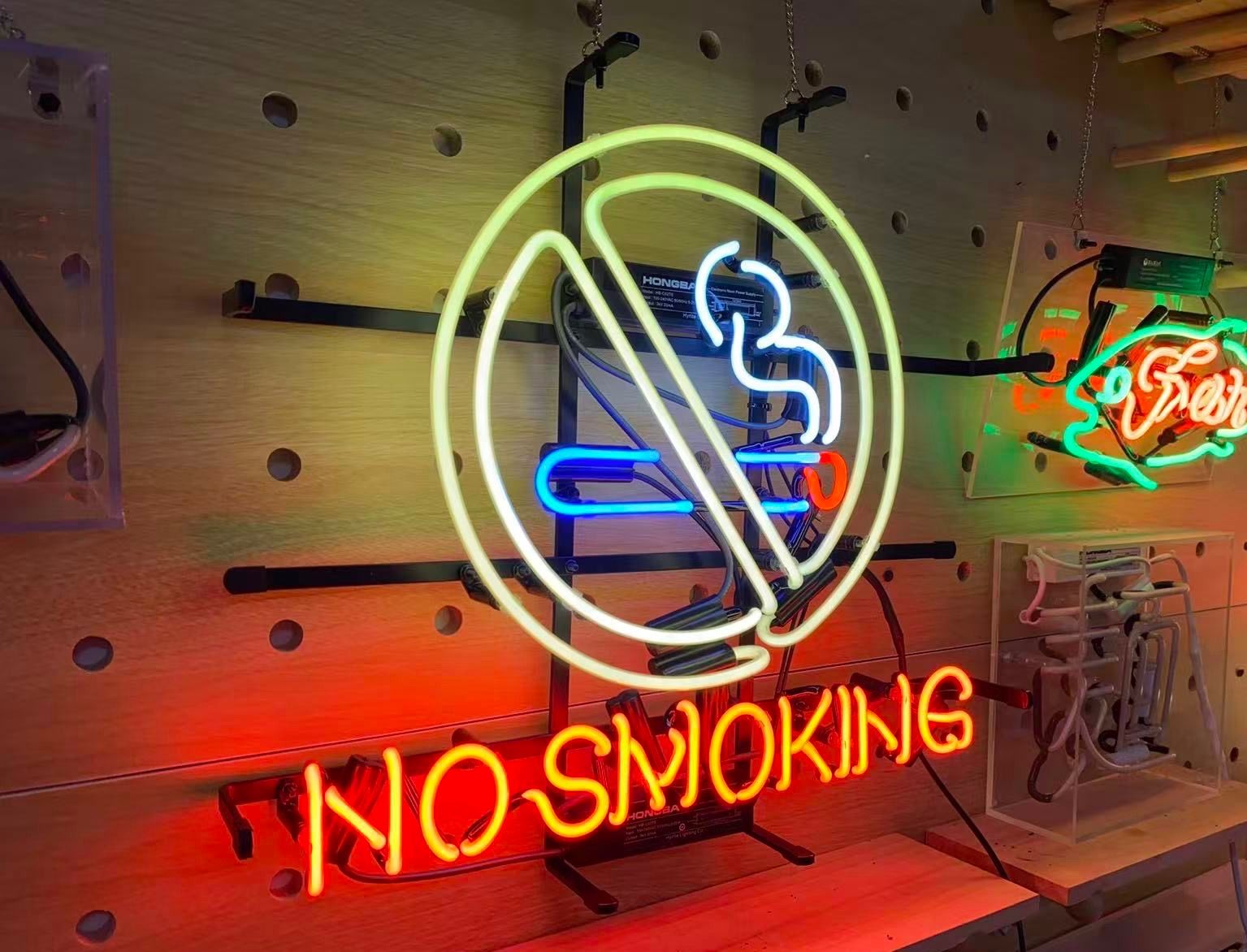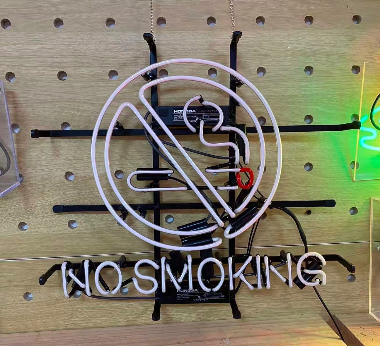 ・デザイン:国際的に認知されている「禁煙マーク」と「NO SMOKING」の文字を組み合わせたネオンサイン。黄色の禁止サークル、青の煙草シルエット、赤の文字が鮮やかに輝き、視認性抜群のデザインです。