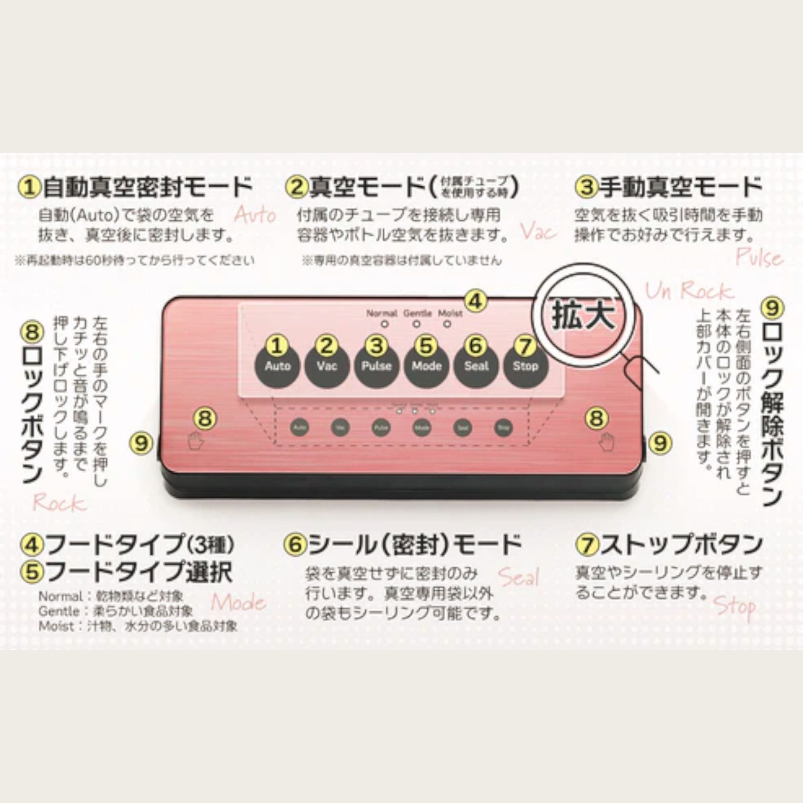 その他手動真空、密閉(シール)のみ、付属のチューブを使用した真空モード(※真空専用チューブに対応している容器やボトル・瓶のストッパーを使用してください)が搭載されています。