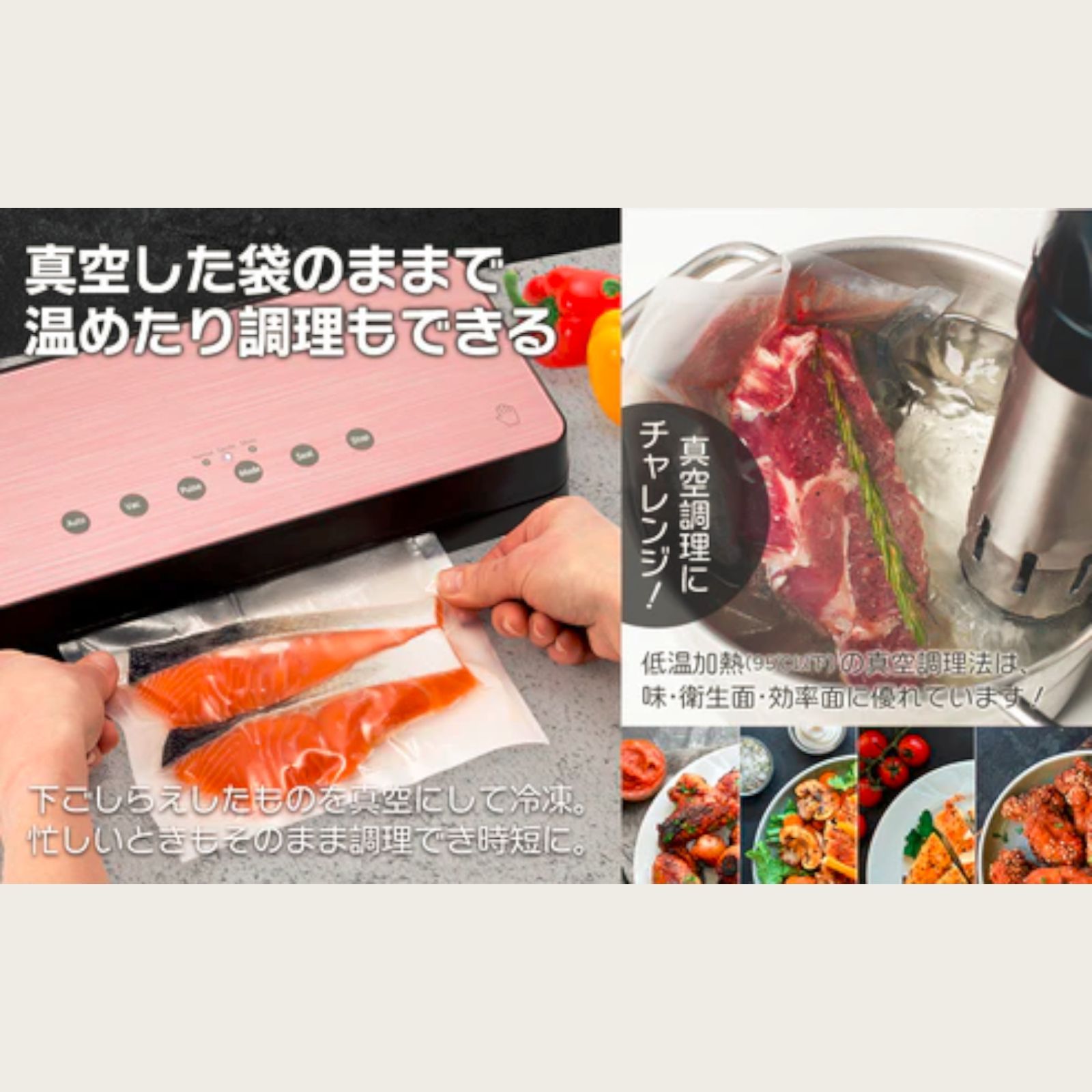 下ごしらえした物を真空にして冷凍したり、真空のまま調理可能で味・衛生面・効率面で非常に優れています。