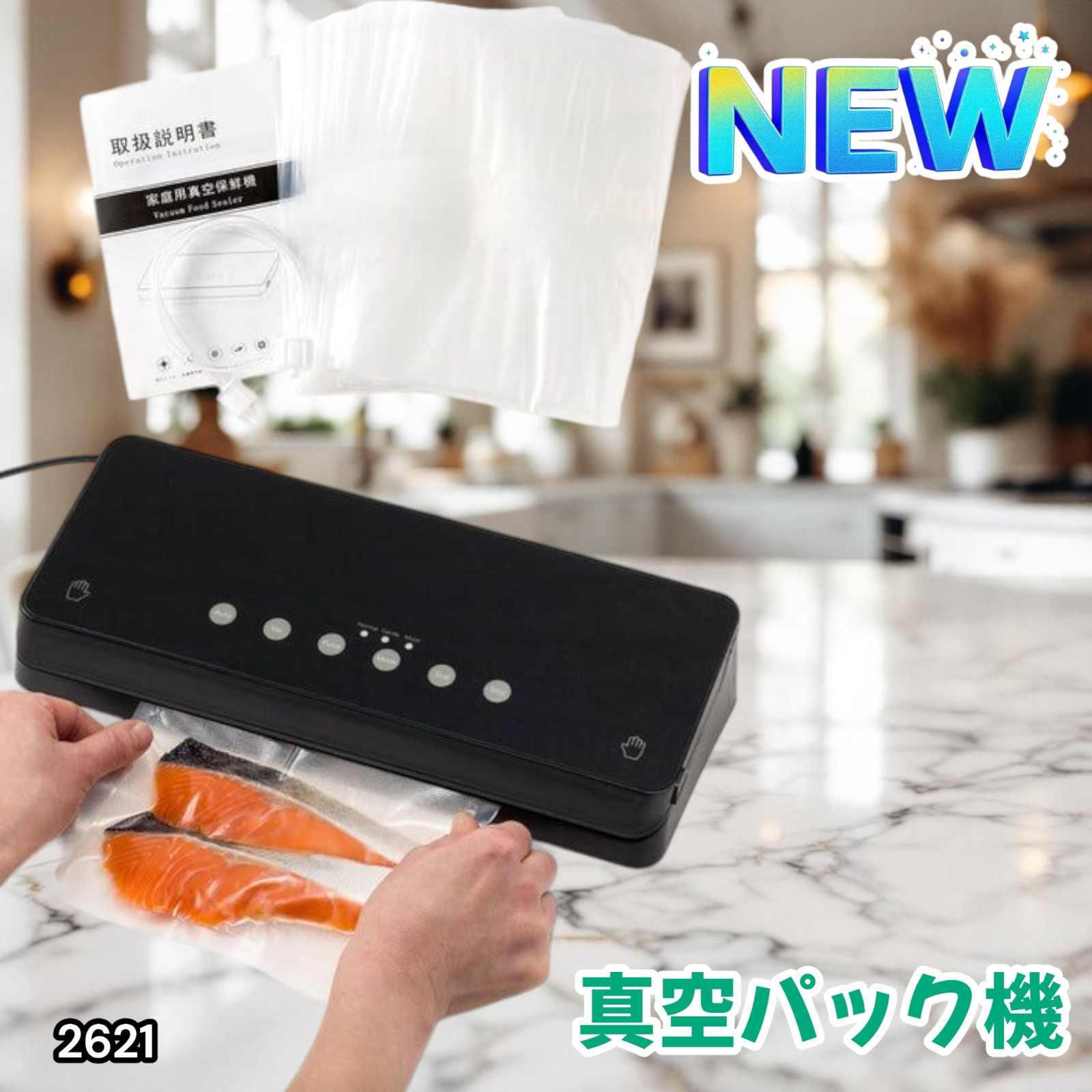 #2621 家庭用 真空パック機 ブラック 全3カラー 自動ワンタッチ 6in1 吸引力-60Kpa 専用袋付き フードシーラー 乾湿対応 ※北海道、沖縄本島、沖縄の離島、その他離島へは別途配送料有り