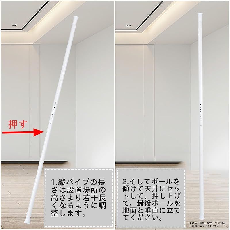 【設置方法】縦パイプの長さは設置場所の高さより若干長くなるように調整します。 例えば、設置場所が200cm の高さであれば205cm程度に調節します。メイン縦棒の片側にスプリング(ばね)が搭載されているため、キャップを付けて縦パイプの天井側を設置したい天井部に押し込むと縦棒が少し沈むようになっていますのでそのまま床側を入れ込みます。▲注意:最後、縦パイプは地面と垂直に立ててください。
