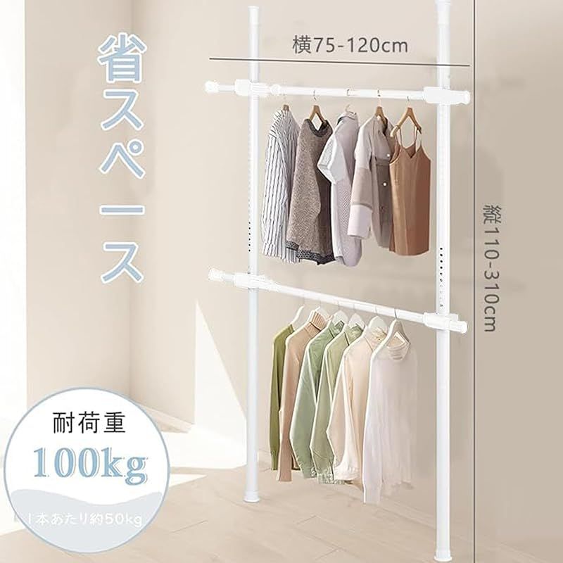 【耐荷重】横パイプ耐荷重は1本あたり約50kgで、総耐荷重約100kgです。洋服を掛けるという日常のニーズを完全に満たすことができます