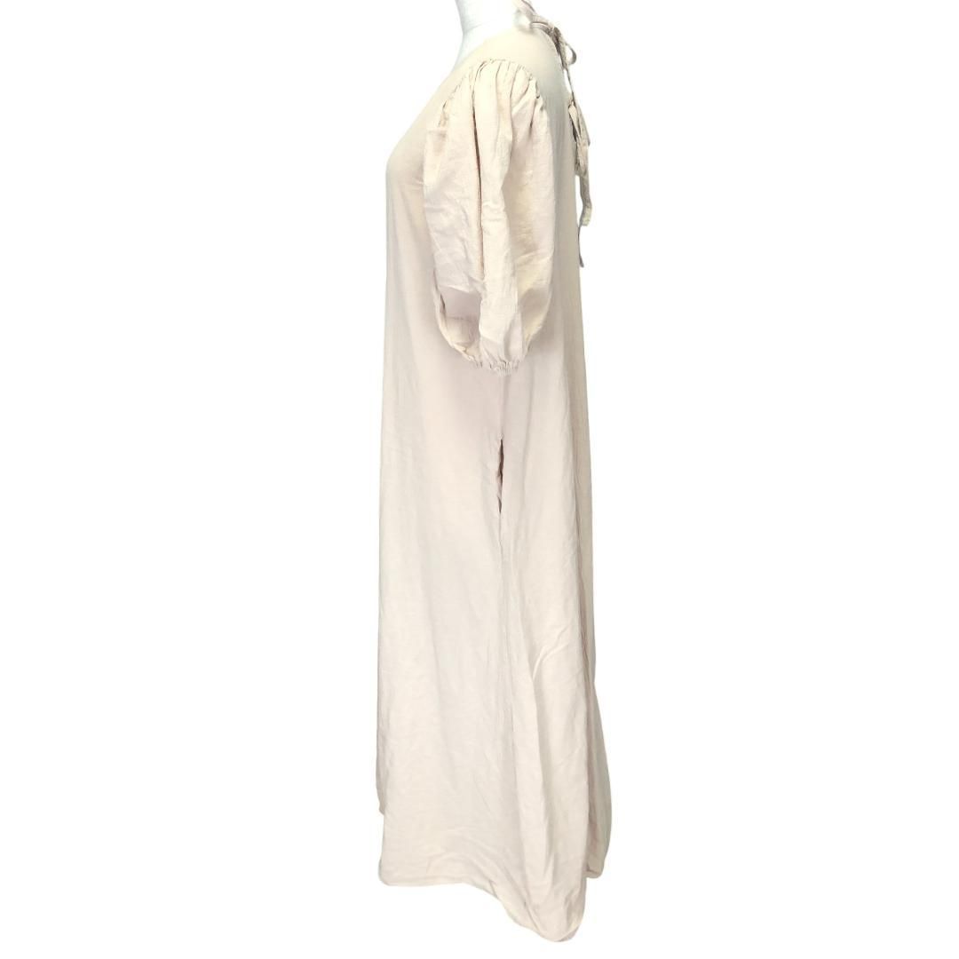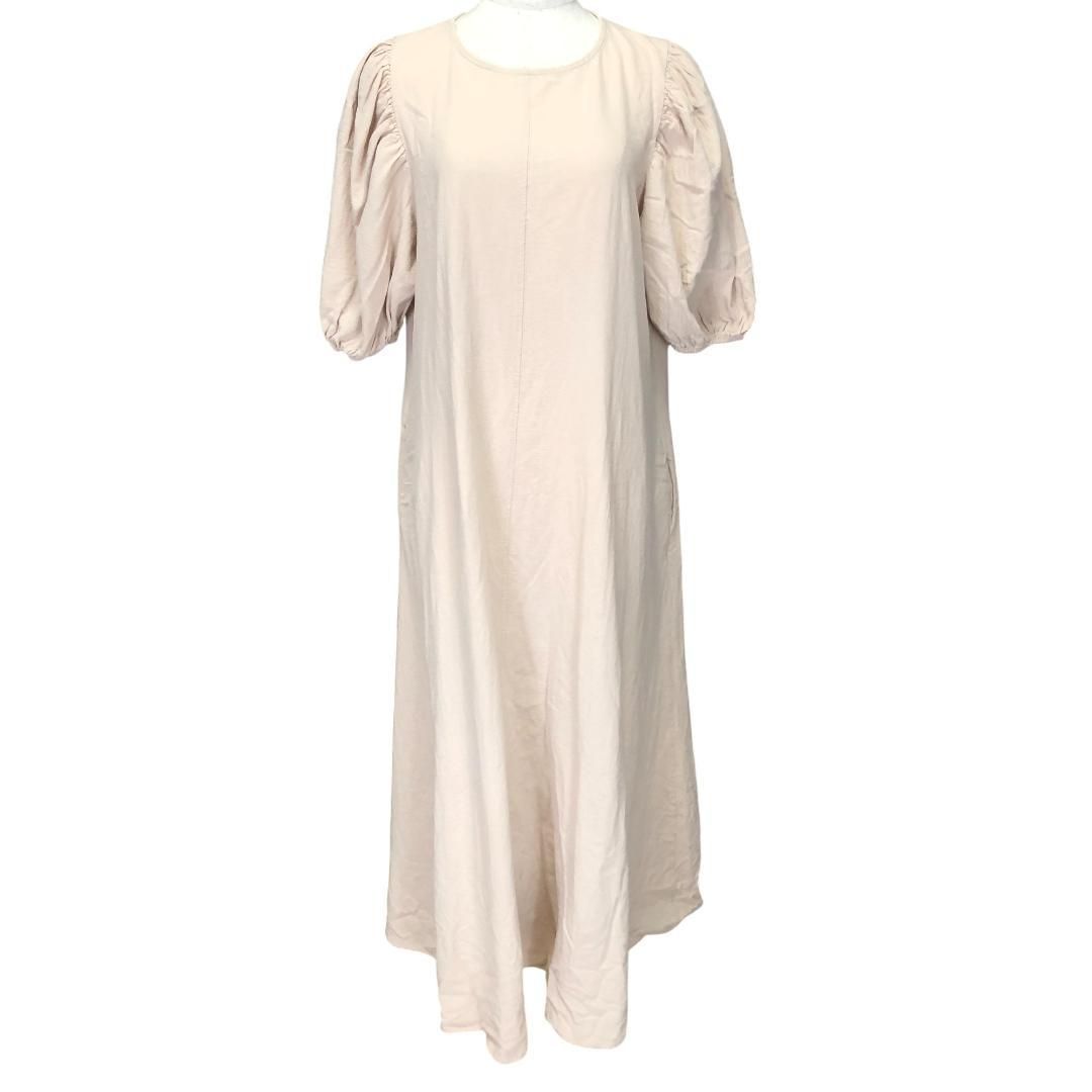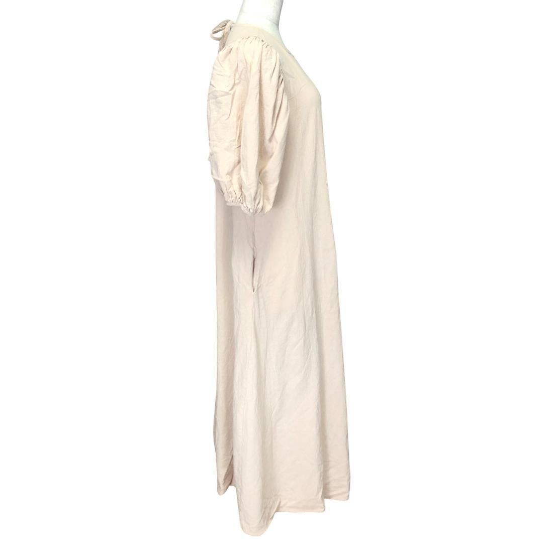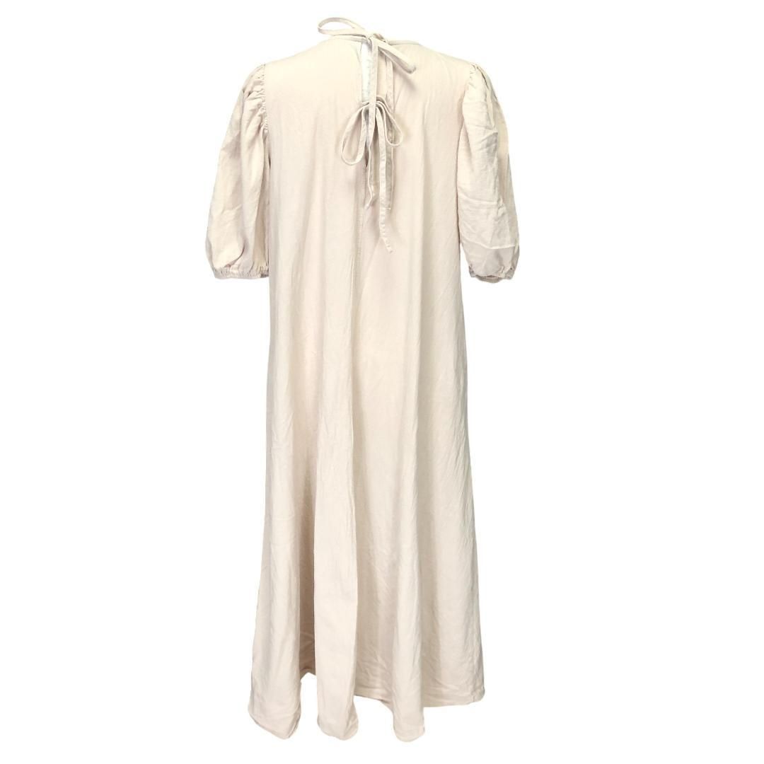 ゆったりとしたシルエットの綿100%ワンピースです。ふんわりとしたパフスリーブ、後ろ19cm開いているところでリボン結びをするデザインです。一枚でさらりと着こなすのはもちろん、カーディガンやジャケットを羽織っても素敵です。両サイド、ポケット付きです。身長160cm着用でくるぶし丈、マキシ丈です。