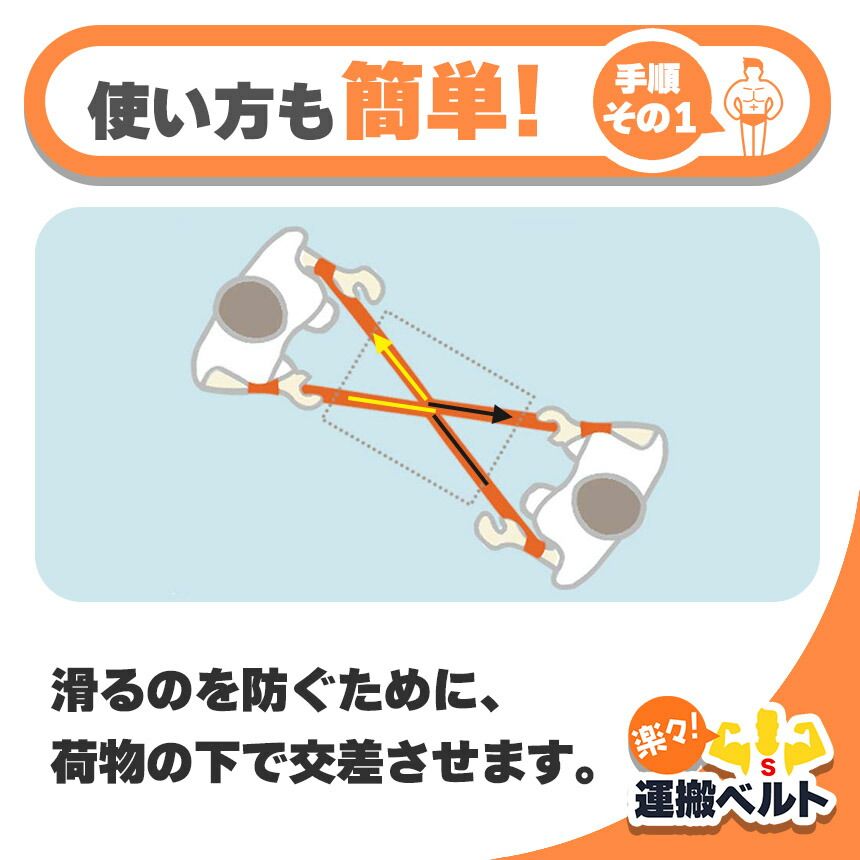 2本クロスさせたベルトを荷物の下に敷き、輪っかを腕にはめたら、両掌で荷物を重心に向かっておさえる形で持ち上げます。輪っかも3か所通すところがあるので、荷物の大きさに合わせて運搬できます。