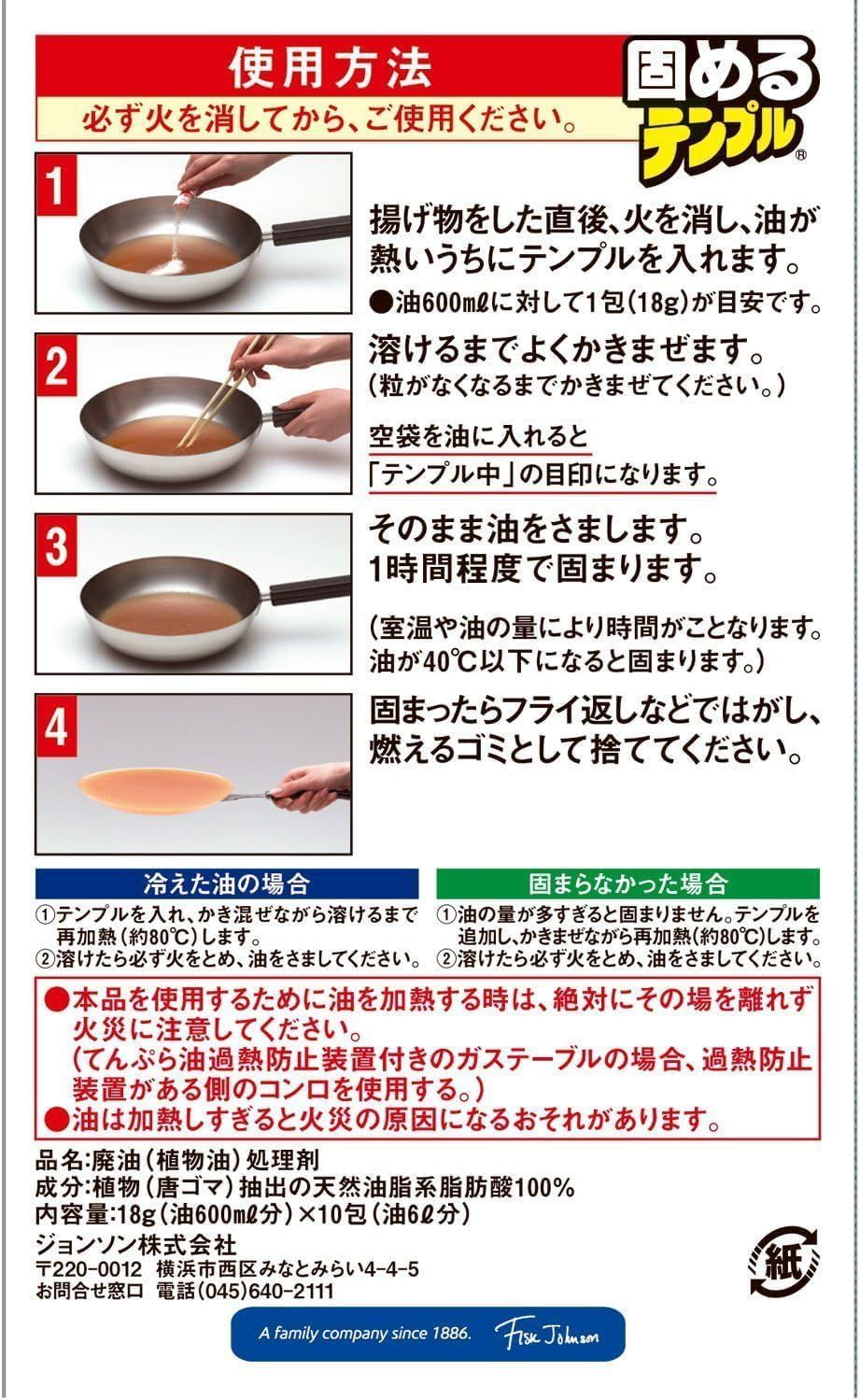 テンプル 油処理剤 固めるテンプル 10包入(1包当たり油600ml) ×3箱テンプル 油処理剤 固めるテンプル 10包入(1包当たり油600ml) は、植物成分100%成分だけを原料としているので、安心してつかえます。テンプル 油処理剤 固めるテンプル 10包入(1包当たり油600ml) は、パワーアップしたので、するっとナベからはがしやすくなりました。一包で600mLの油を固めて、手やキッチンを汚さずに、簡単に油を捨てられます。