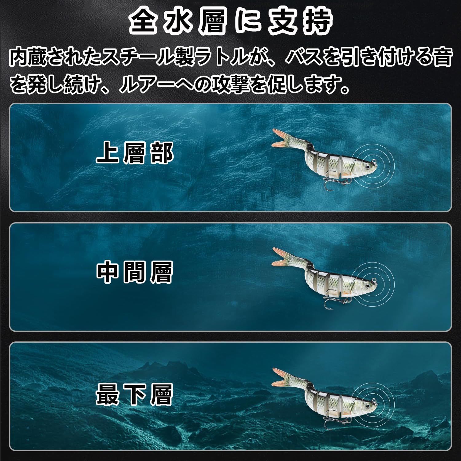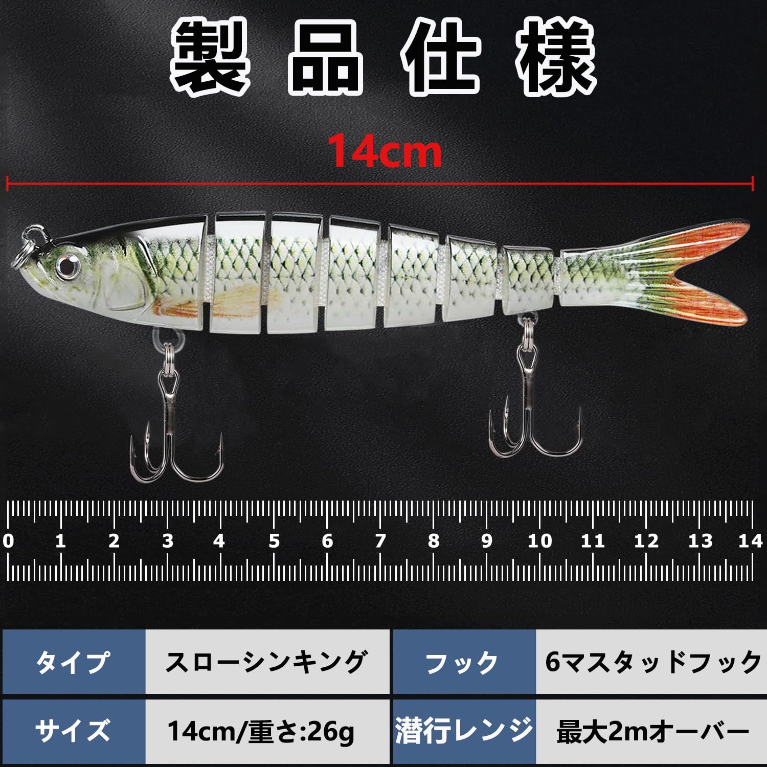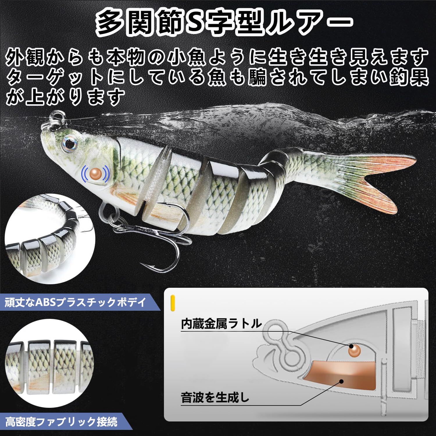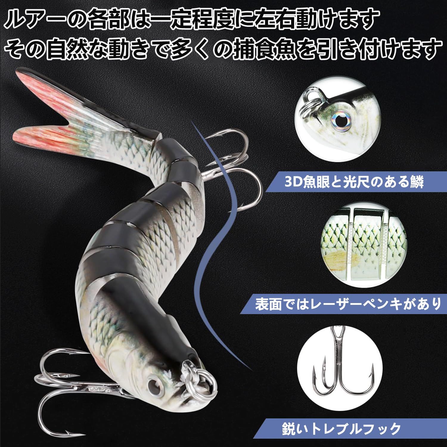 ★【高いシミュレーション】ABS素材で作られた本物に近い3D魚眼と光沢のある鱗を持つスイムベイトは、実際の魚の色や模様を巧みに再現します、外観からも本物の小魚ように生き生き見えます。ターゲットにしている魚も騙されてしまい、釣果が上がります。また、飛行時にジョイント部の可動域を制御する事は比較的簡単に出来ます。しかし、着水と同時に可動域が復元される。
