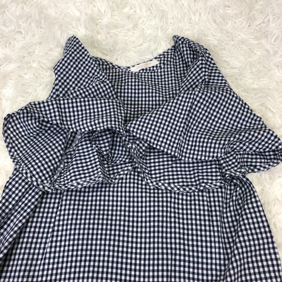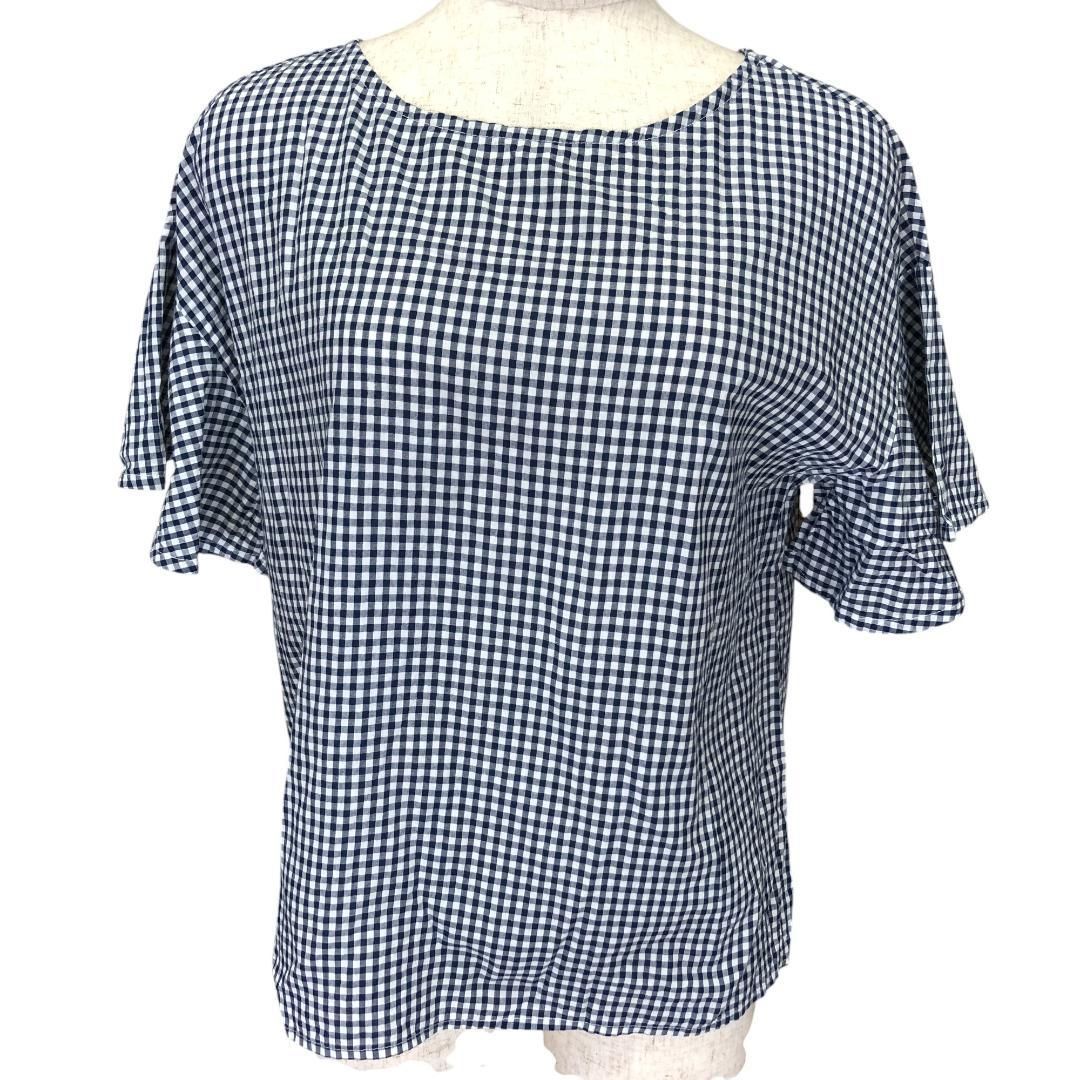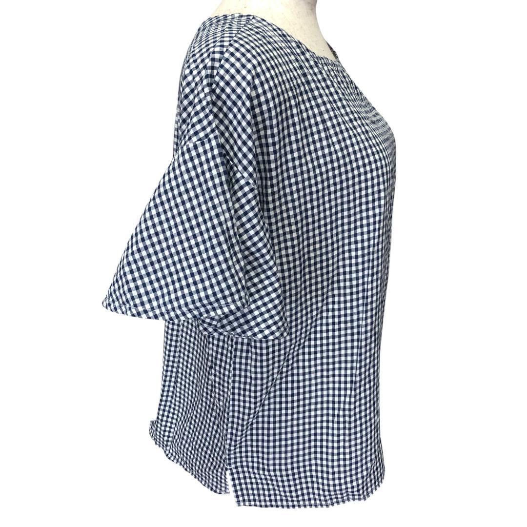 ネイビーとホワイトのギンガムチェック柄が爽やかな半袖トップスです。ゆったりとしたシルエットで体型カバーもできます。袖口はフリルデザインになっています。カジュアルながらも上品な印象で、普段使いからちょっとしたお出かけまで幅広く活躍します。後ろの丈が少し長いです。前55/後ろ59。