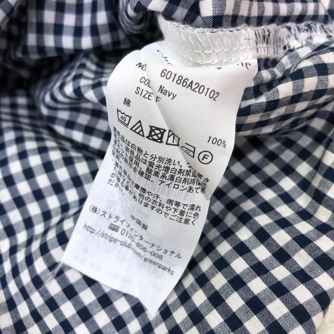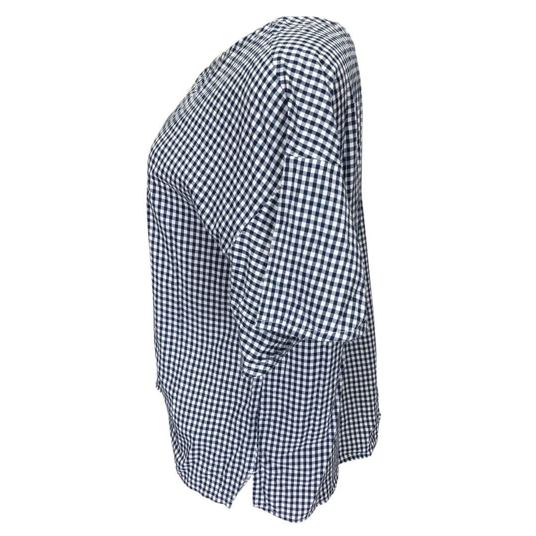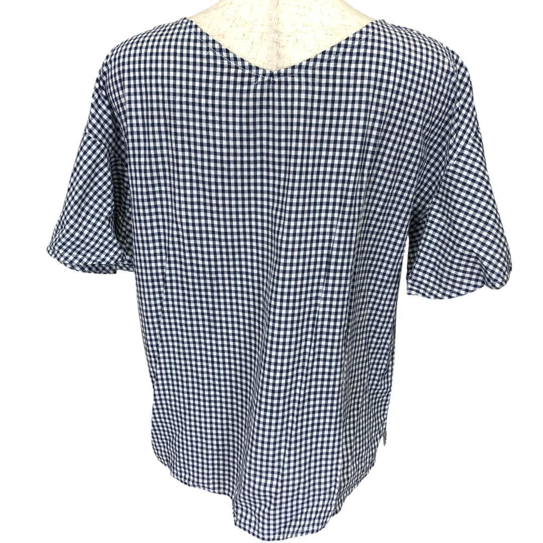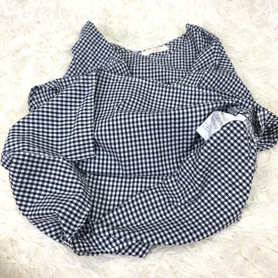 ネイビーとホワイトのギンガムチェック柄が爽やかな半袖トップスです。ゆったりとしたシルエットで体型カバーもできます。袖口はフリルデザインになっています。カジュアルながらも上品な印象で、普段使いからちょっとしたお出かけまで幅広く活躍します。後ろの丈が少し長いです。前55/後ろ59。