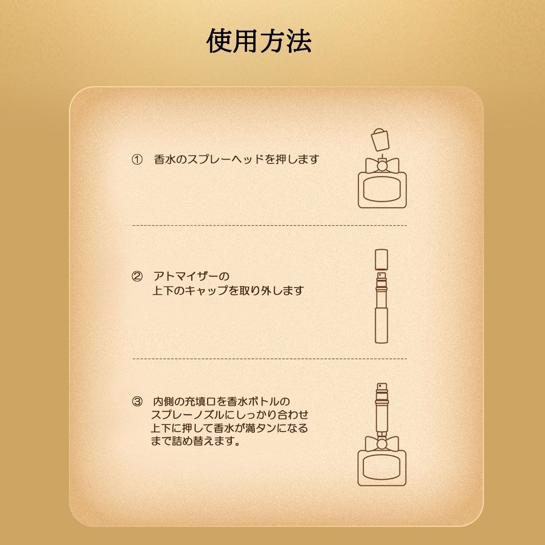 【ご注意】元の香水のノズルサイズ:1.香水キャップが取り外せるもの;2.香水のノズルの直径が2-5mm範囲内であるまの、長さの範囲が4mm以上;香水のノズルのタイプについて:直/円柱状は詰め替えできます;使用出来ない対象:香水のキャップが取り外せるないものとノズルが太いもの(5mm以上);ホーン状/きのこ状/傘状など、詰め替えができません。