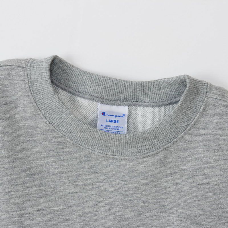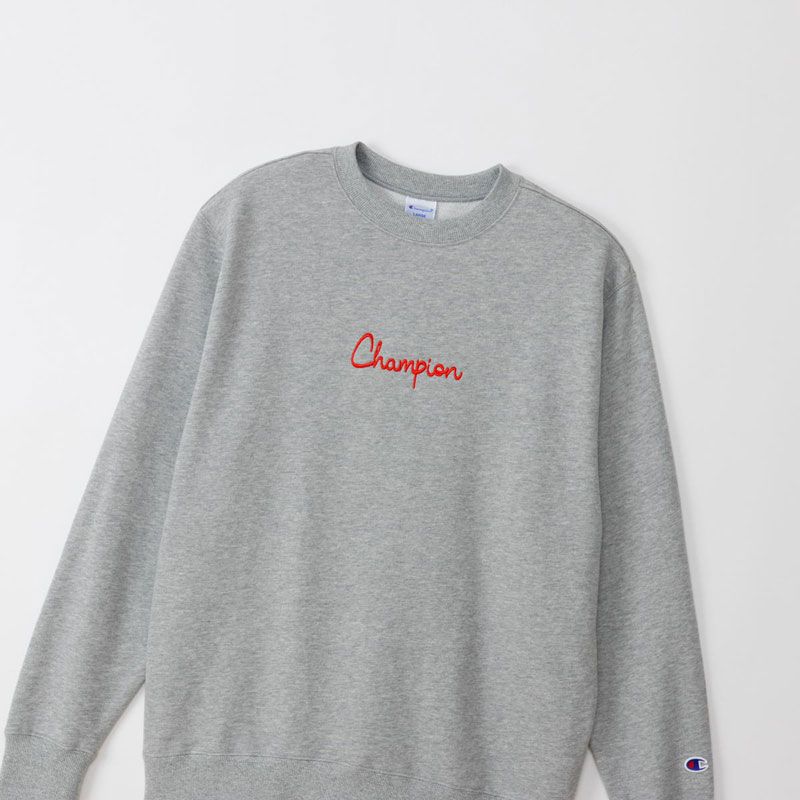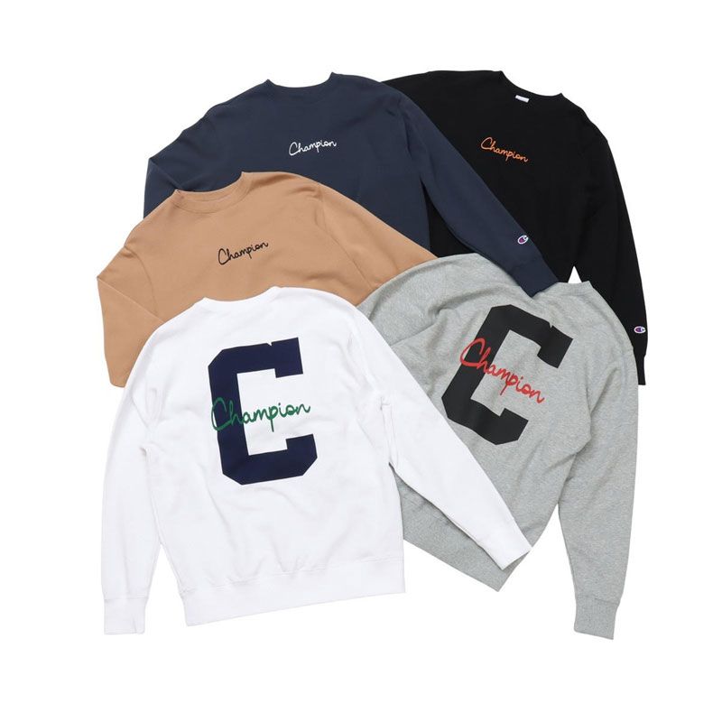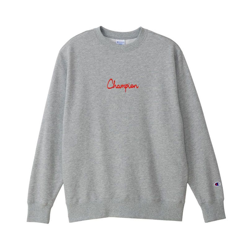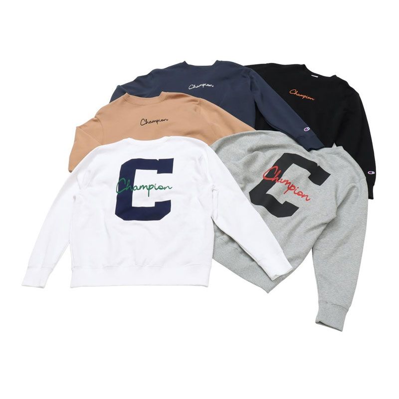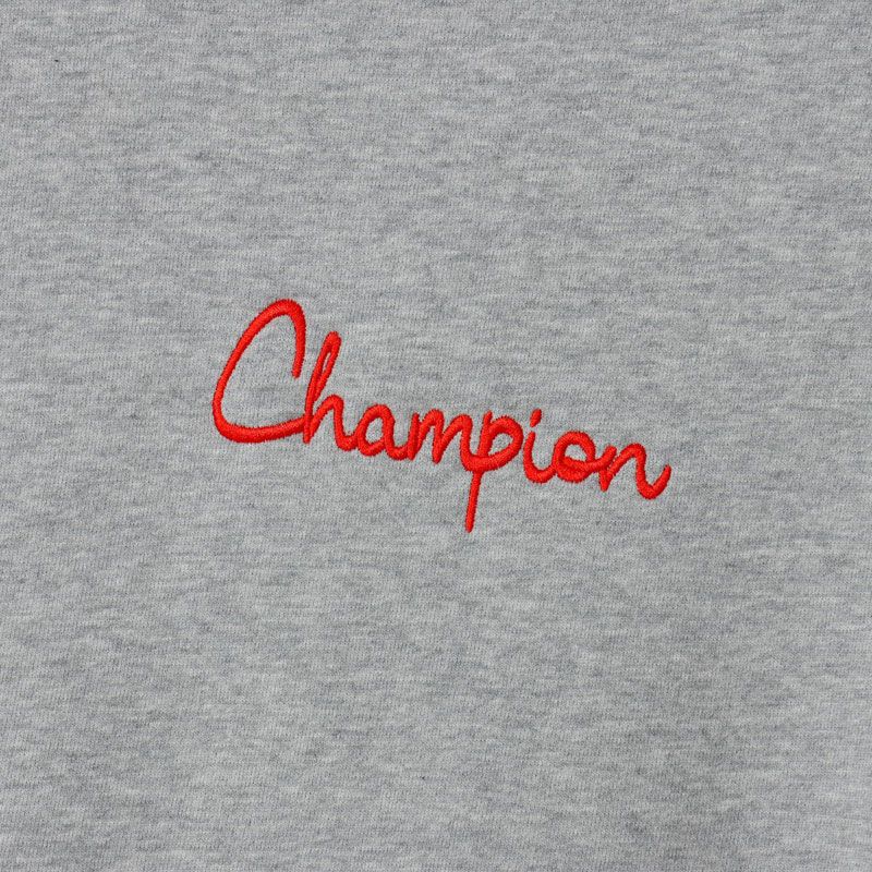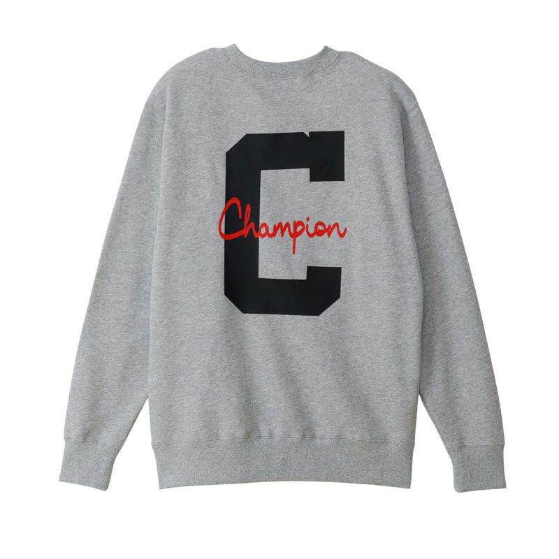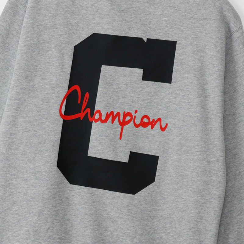 胸には手書き風の書体による「Champion」の刺繍、背中には同じ書体の「Champion」をブロック書体の大きな「C」に重ねたグラフィックのプリント入り。