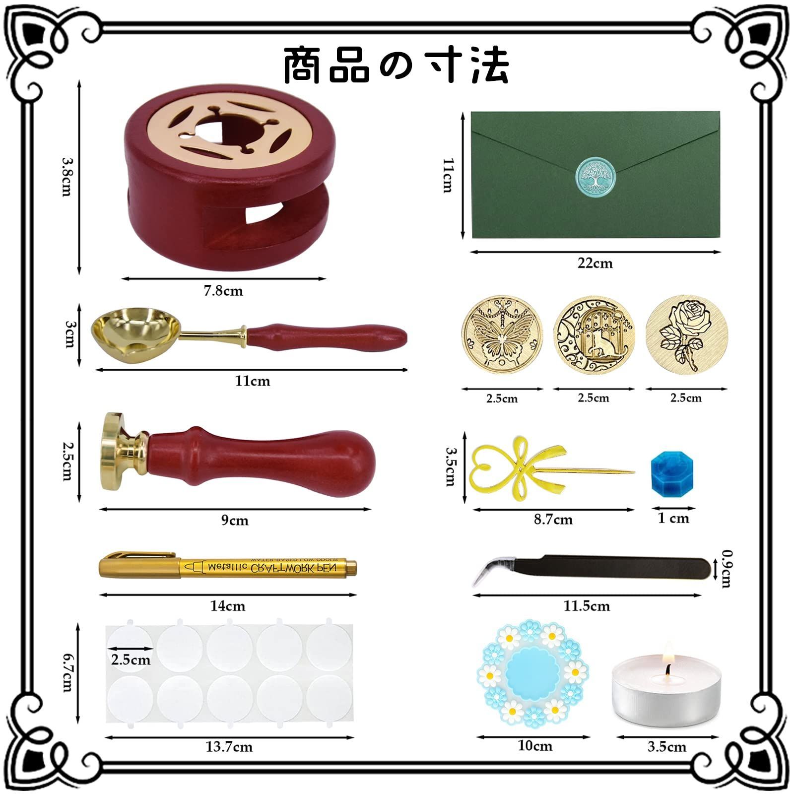 【豊かなセット内容】24色のシーリングワックス(各色約25個、合計600個)、加熱専用スプーン1本、カラーペン2本(金・銀)、キャンドル6個、ワックス炉1個、スタンプハドル1本(ヘッド3個)、スタンプ台1枚、手紙セット10枚、ピンセット1本、攪拌棒1本、両面シール10枚合計15点で、初心省としても簡単に上手になります!