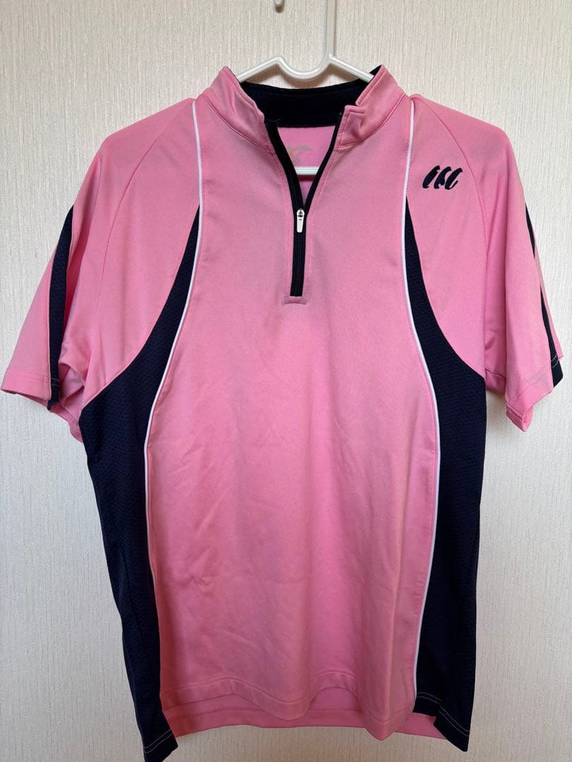 ジッパー付きのピンクとネイビーの卓球ウェア、軽量で通気性に優れたポリエステル素材。