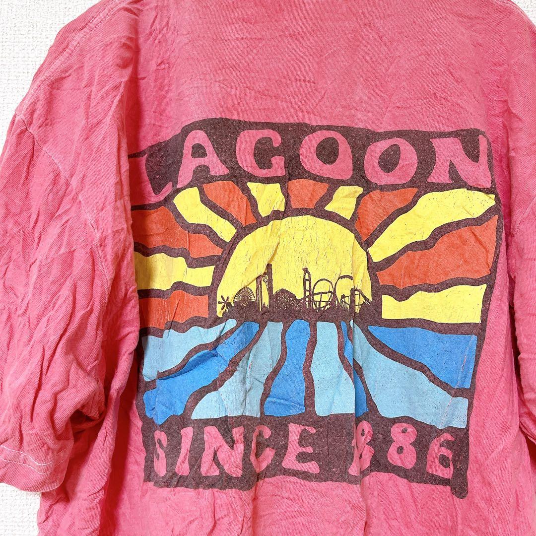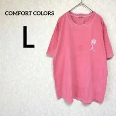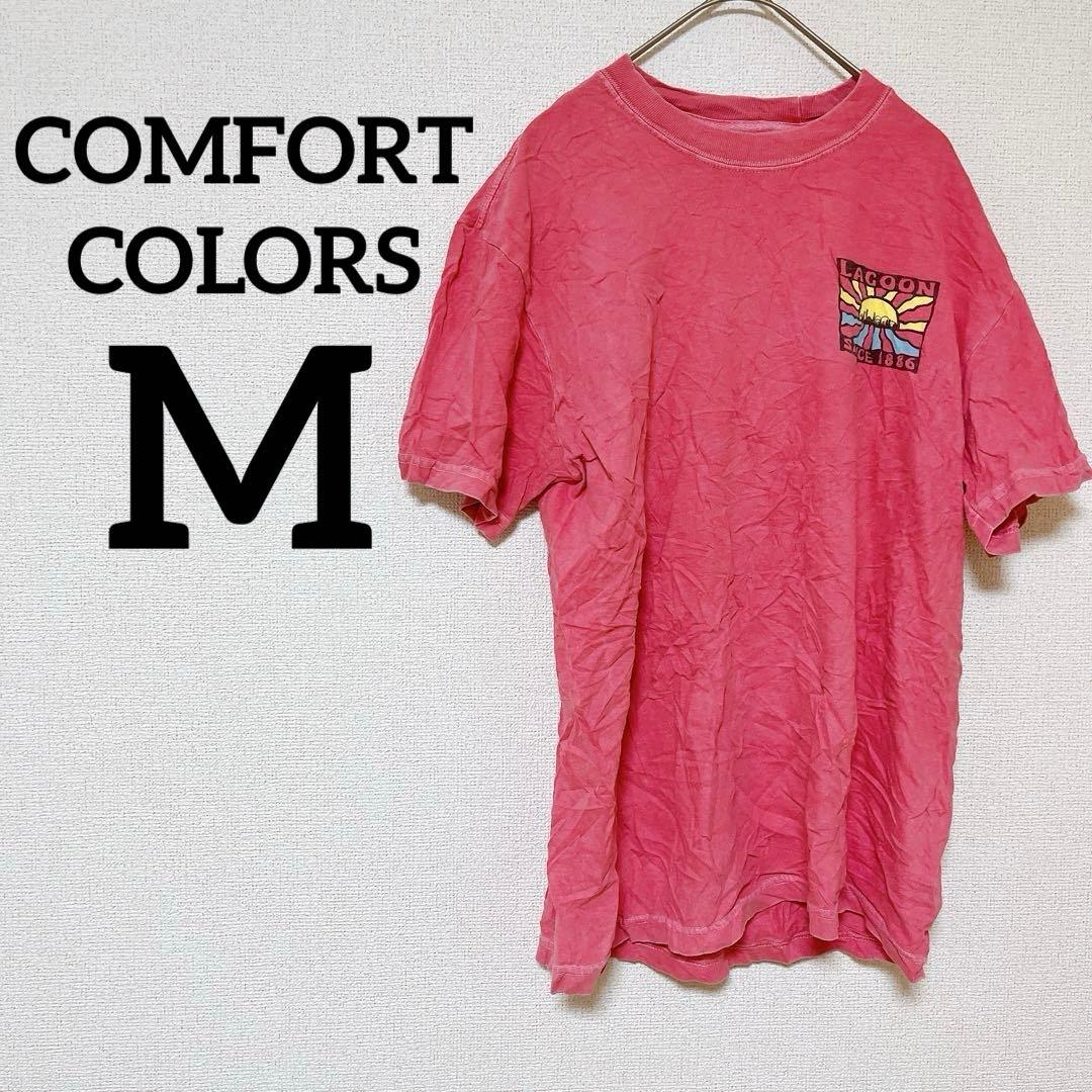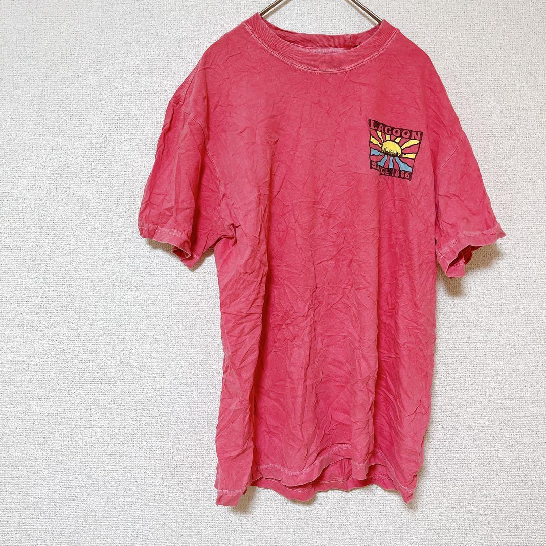 フロントにカラフルなプリントが施された、100%コットン製のピンクのTシャツ。