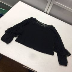 レース装飾のオフショルダー長袖トップス、シースルー素材でエレガントな印象。