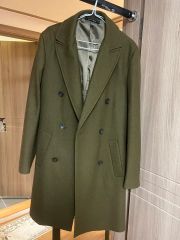 ウール混紡のグレーのダブルブレストチェスターコート、シンプルでスタイリッシュなデザイン。