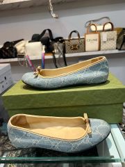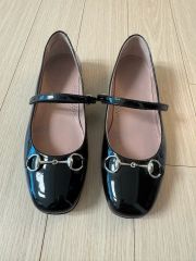 ポインテッドトゥのレザー フラットバレエシューズ。乗馬の世界にルーツを持つグッチの伝統を象徴するシンボル、大ぶりなホースビットとシルバートーンのチェーンをあしらっています。このシューズが登場した最新コレクションでは、アクセサリーとウェアのコーディネートによって自由な自己表現をたたえました。