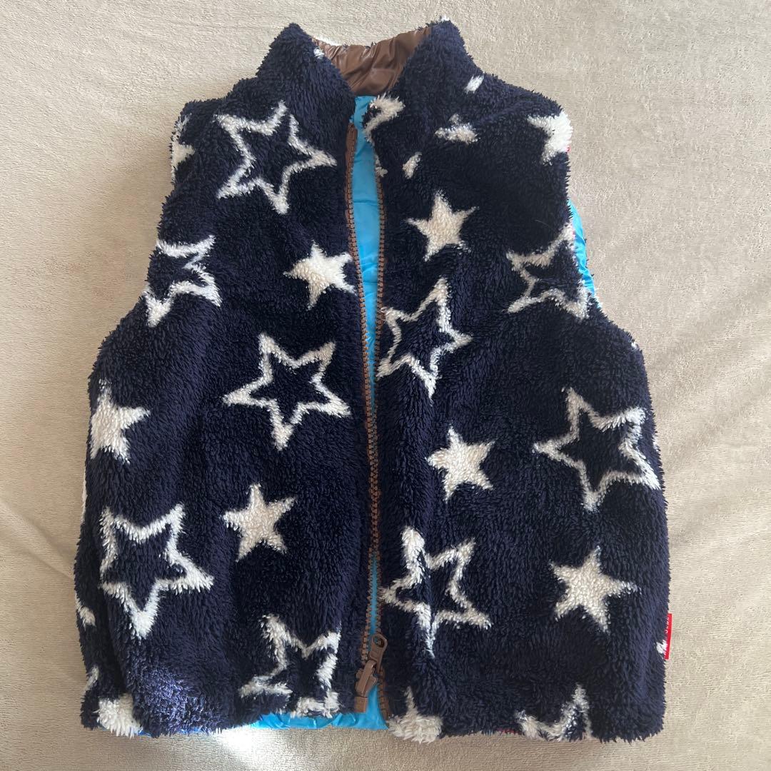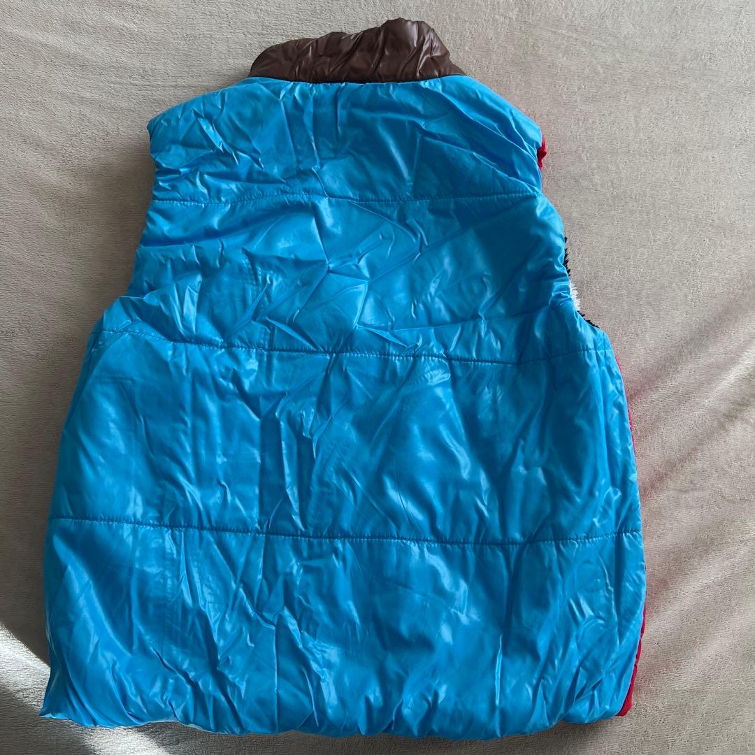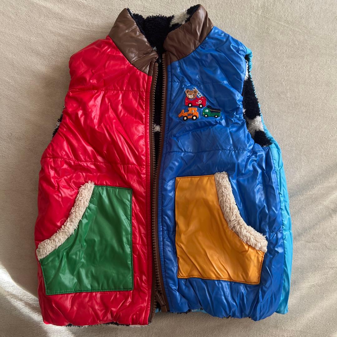 カラフルなデザインのダウンベスト、ポケットと刺繍付きで、裏地はフリース素材で暖かい。