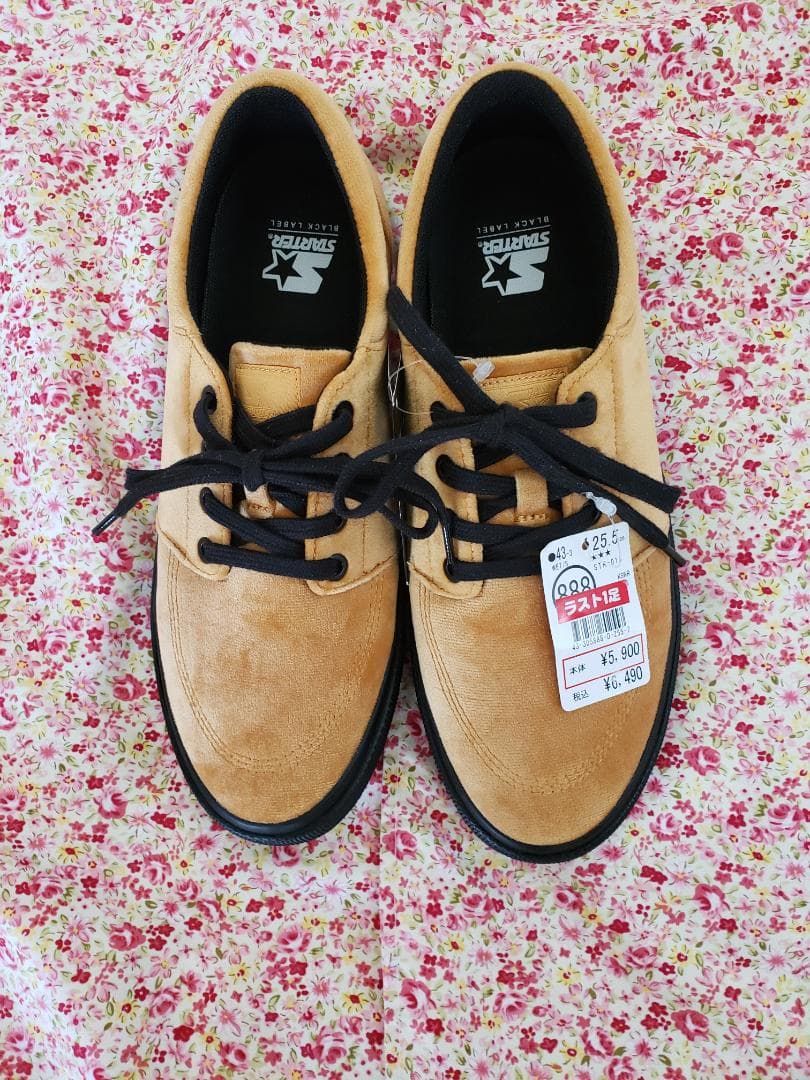 スエード素材のベージュスケートシューズ、ゴムソールで耐久性抜群。