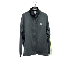 フード付きのMizunoジャケット、黒と金の配色で、通気性のあるメッシュパネルを使用。