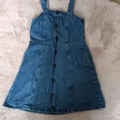デニム素材のジャンバースカート、サイドボタン付きでスタイリッシュ。