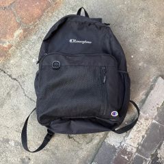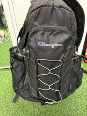 メッシュポケット付きのブラックリュック、耐久性のあるナイロン素材。