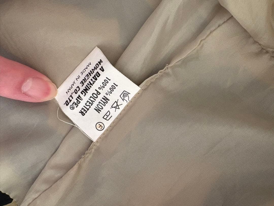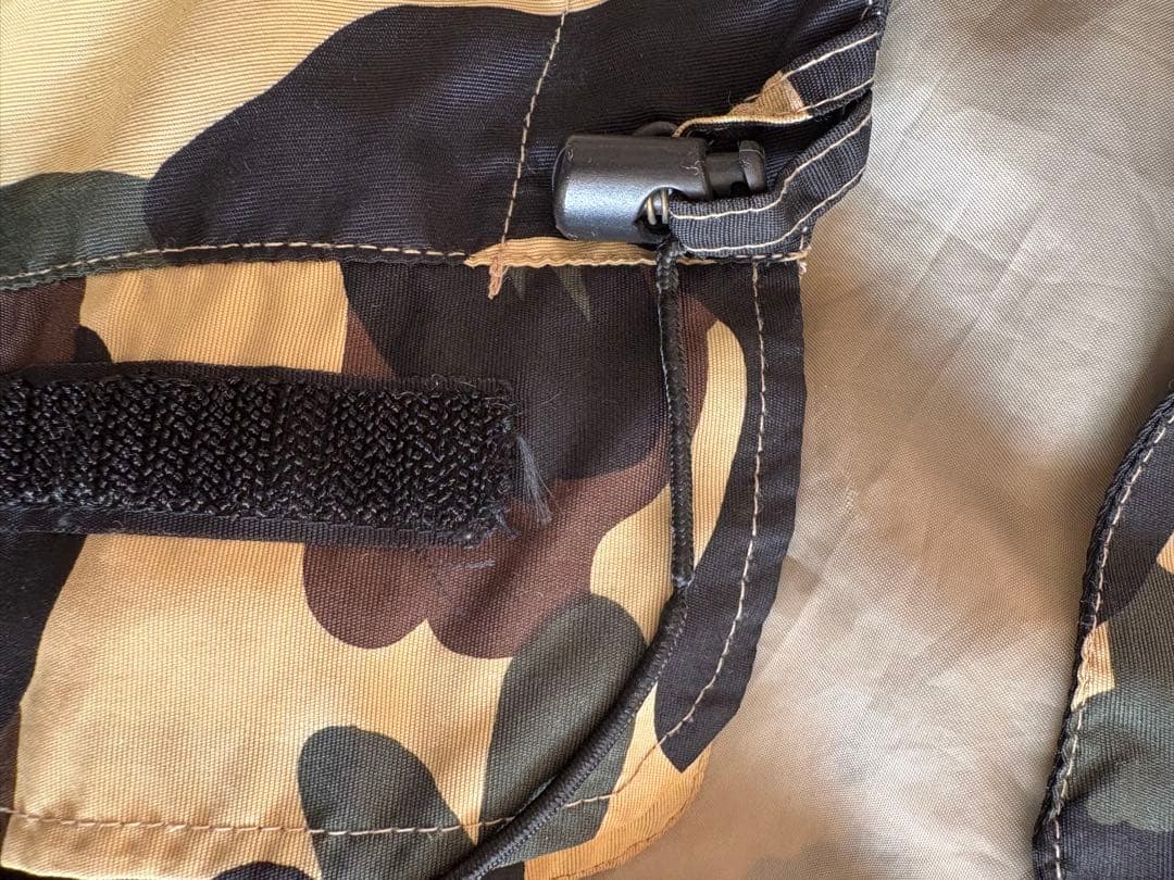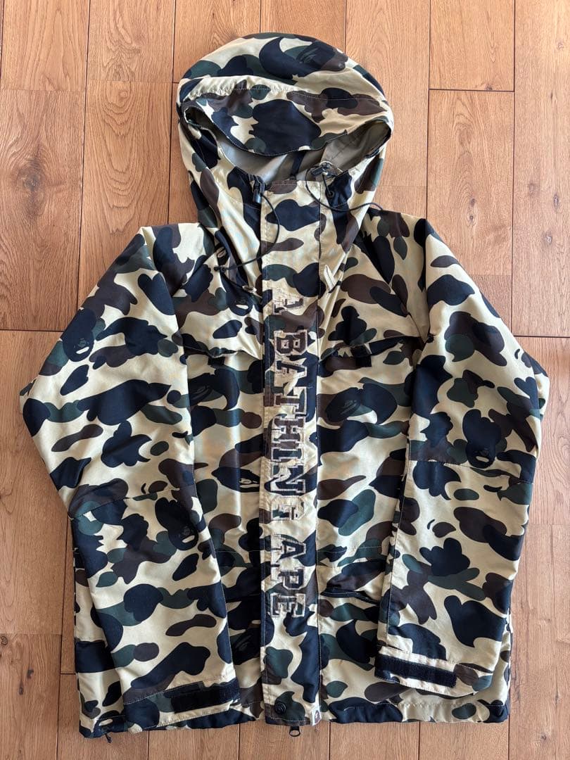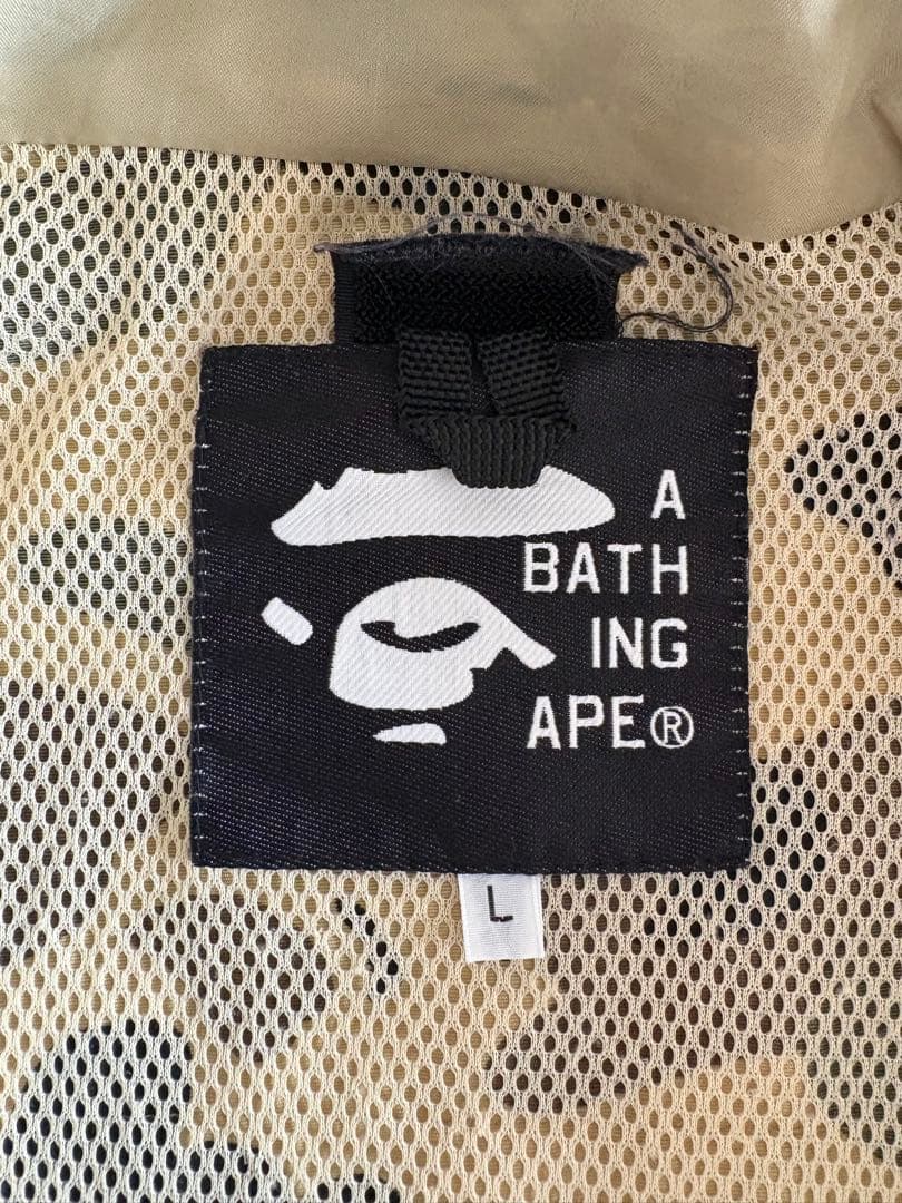 A BATHING APEのカモフラージュ柄フード付きジャケット、ナイロン100%素材で軽量。