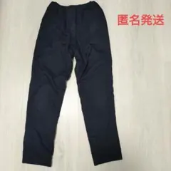 ブラックのロングパンツ、ウエストゴムで快適な着用感。