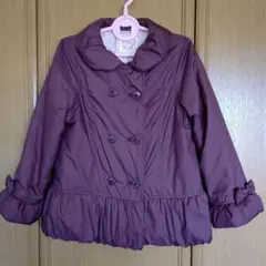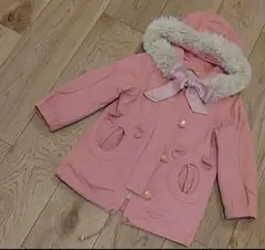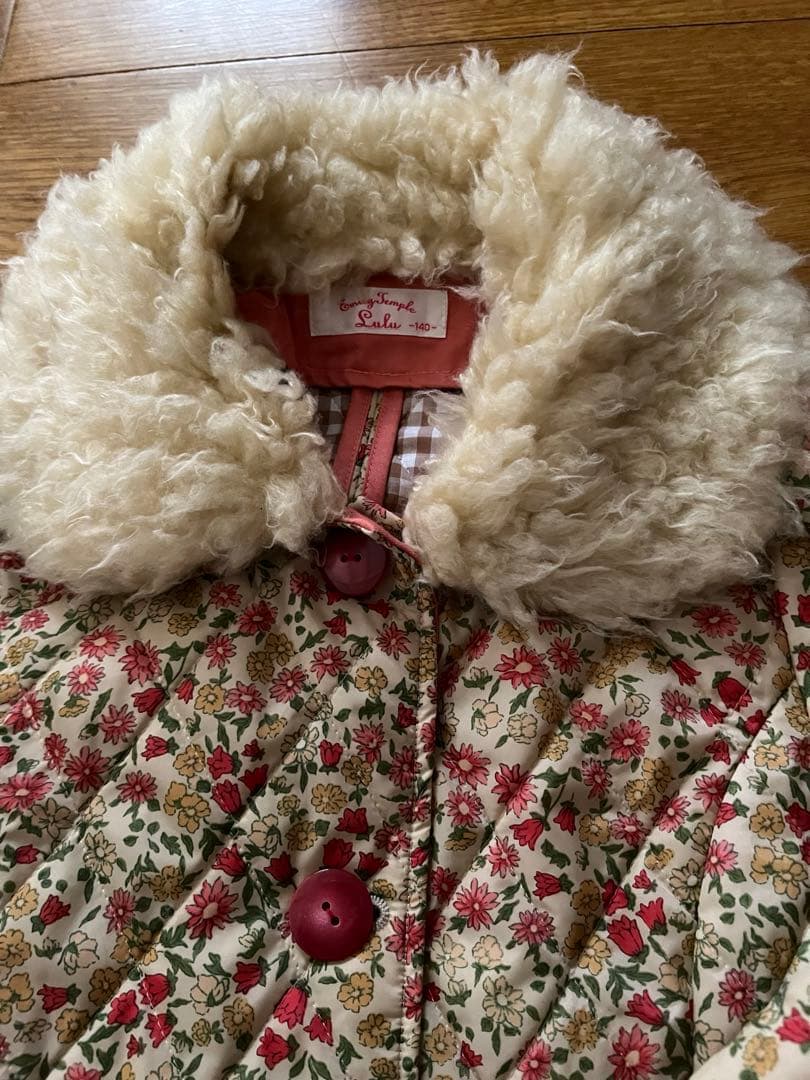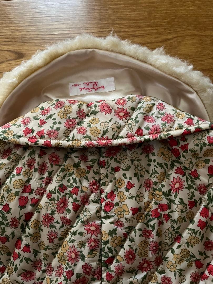 花柄のキルティングにボアの襟や、リボン等凝った作りの可愛いコートです。