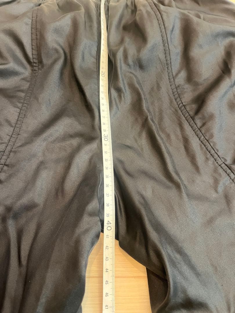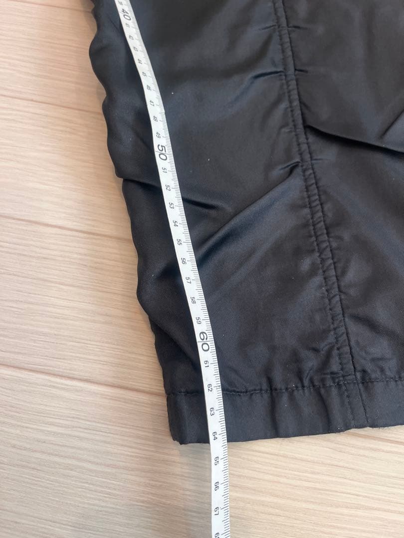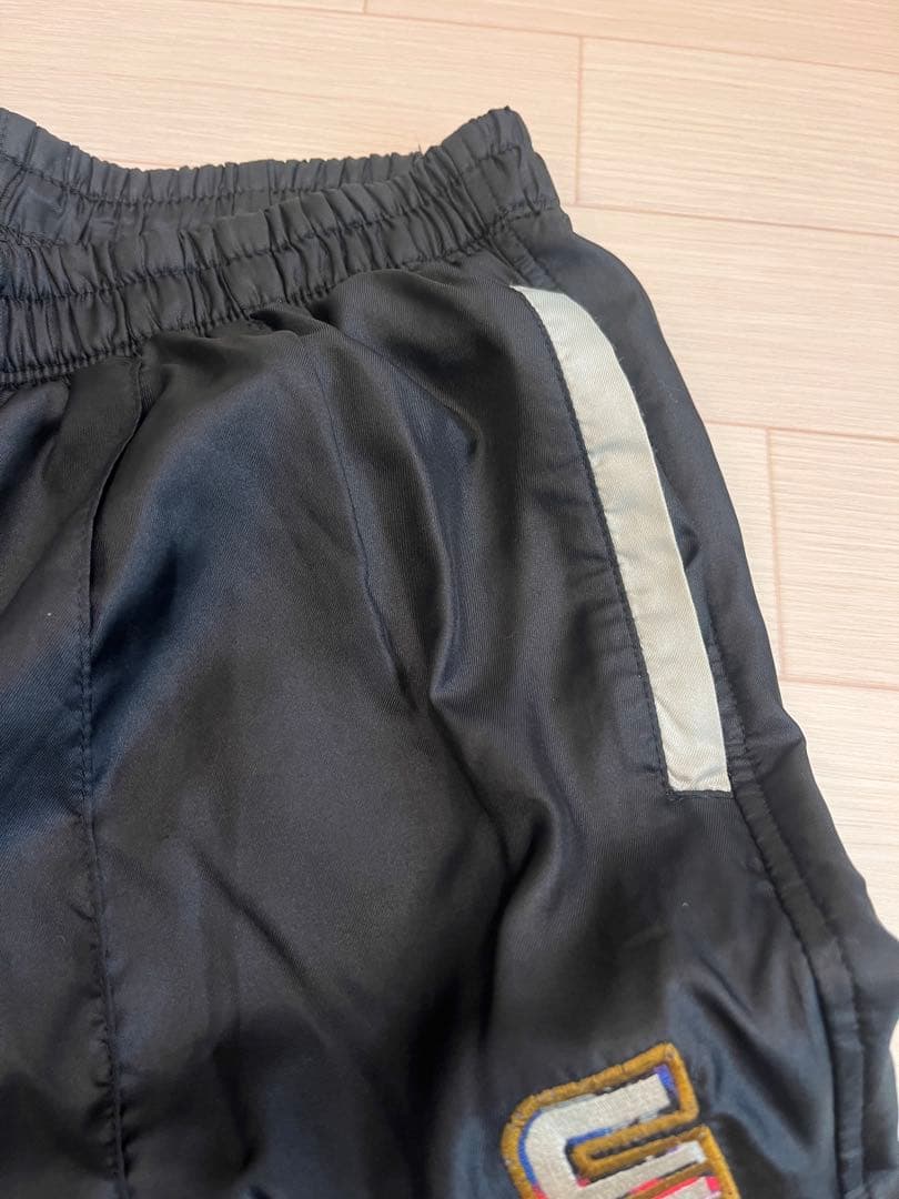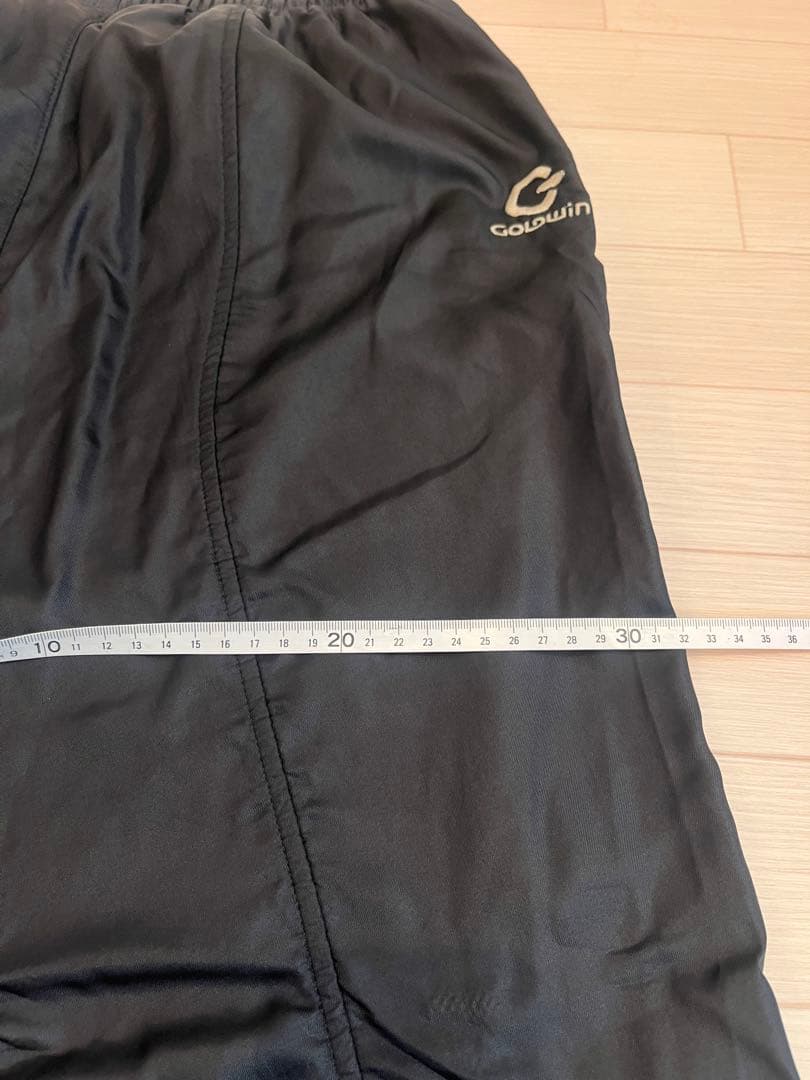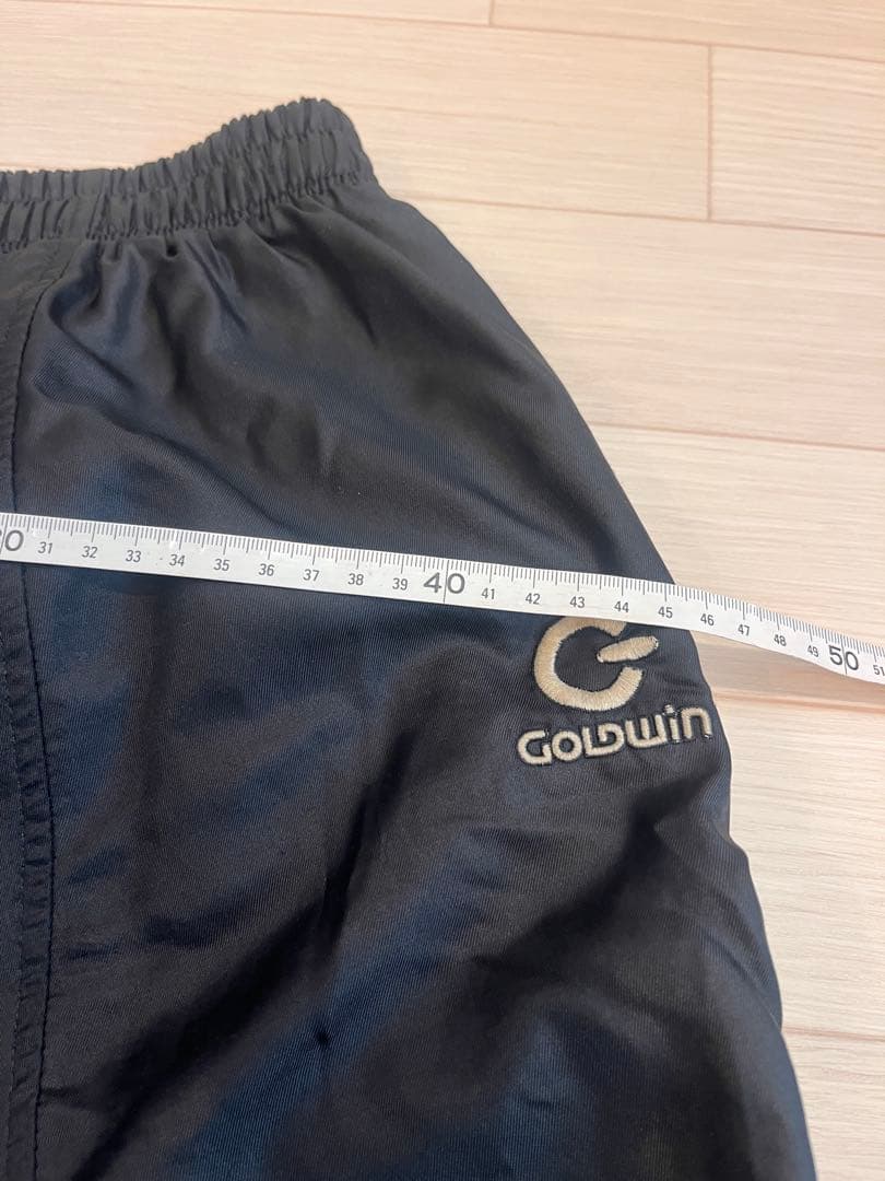 GOLDWINのブラックパンツ、刺繍ロゴ付き、ナイロン素材で軽量。